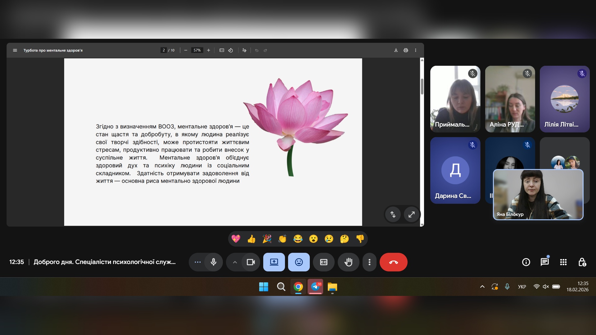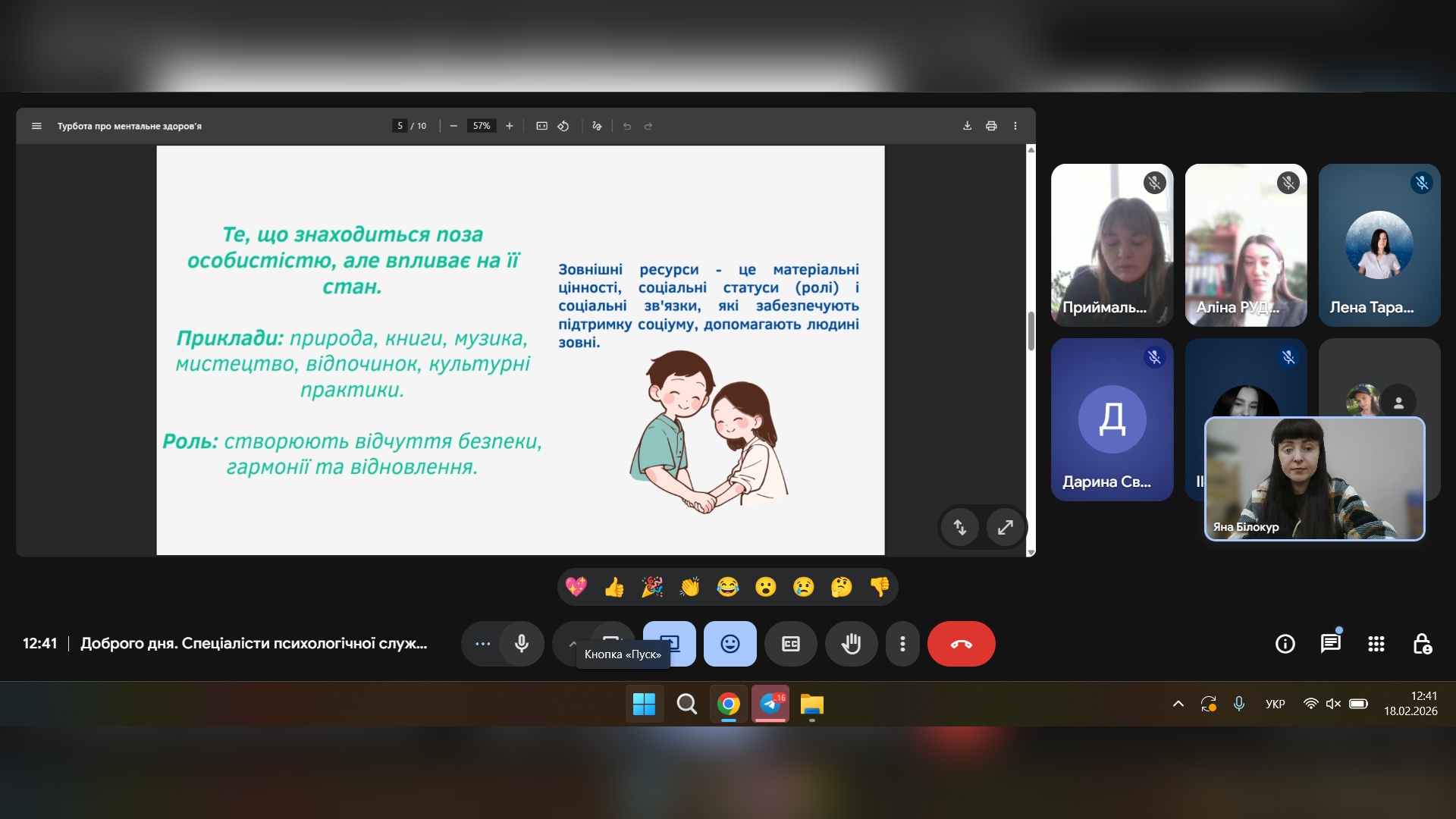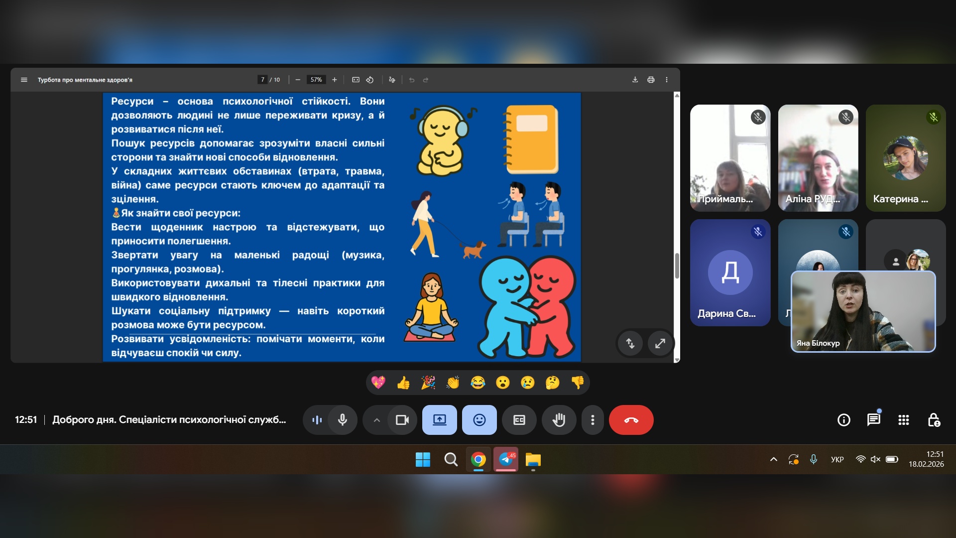 18 лютого спеціалісти психологічної служби провели онлайн-захід: «Ресурси та ментальне здоров'я», де учасники зустрічі мали змогу дізнатися більше інформації про ментальне здоров'я, ресурси та як розпізнавати й використовувати власні сили для подолання стресу та життєвих криз.