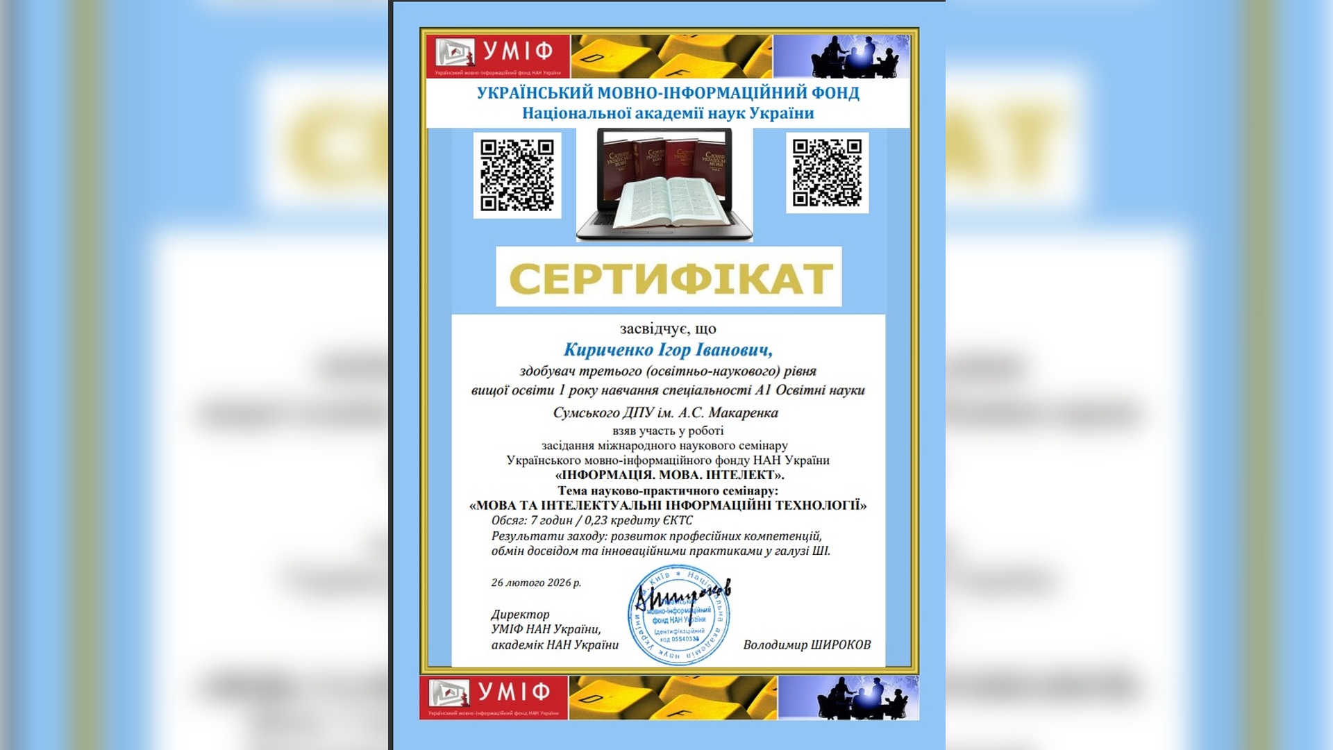 Важливим етапом співпраці стала участь аспірантів, викладачів та Центру науково-освітнього партнерства СумДПУ у Міжнародному науковому семінарі «Інформація. Мова. Інтелект», що відбувся 19 та 26 лютого 2026 року. Цьогорічна тема – «Мова та інтелектуальні інформаційні технології» – об’єднала провідних науковців і молодих дослідників навколо питань штучного інтелекту та великих мовних моделей (LLM).