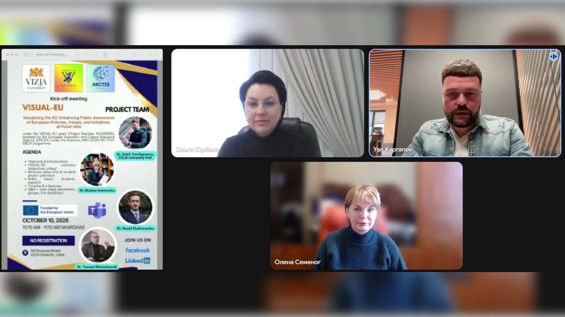 Університет VIZJA у Варшаві (Польща) та Сумський державний педагогічний університет імені А.С. Макаренка продовжує співпрацю в межах грантового проєкту Університету VIZJA (Варшава, Польща) «VISUAL-EU - Візуалізація ЄС: підвищення обізнаності громадськості про європейську політику, цінності та ініціативи в польських ЗВО» (Грантова угода 101235890 - VISUAL-EU - ERASMUS-JMO-2025-HEI-TCH-RSCH), надана Європейським виконавчим агентством з освіти та культури (EACEA) за програмою ERASMUS-JMO-2025-HEI-TCH-RSCH.