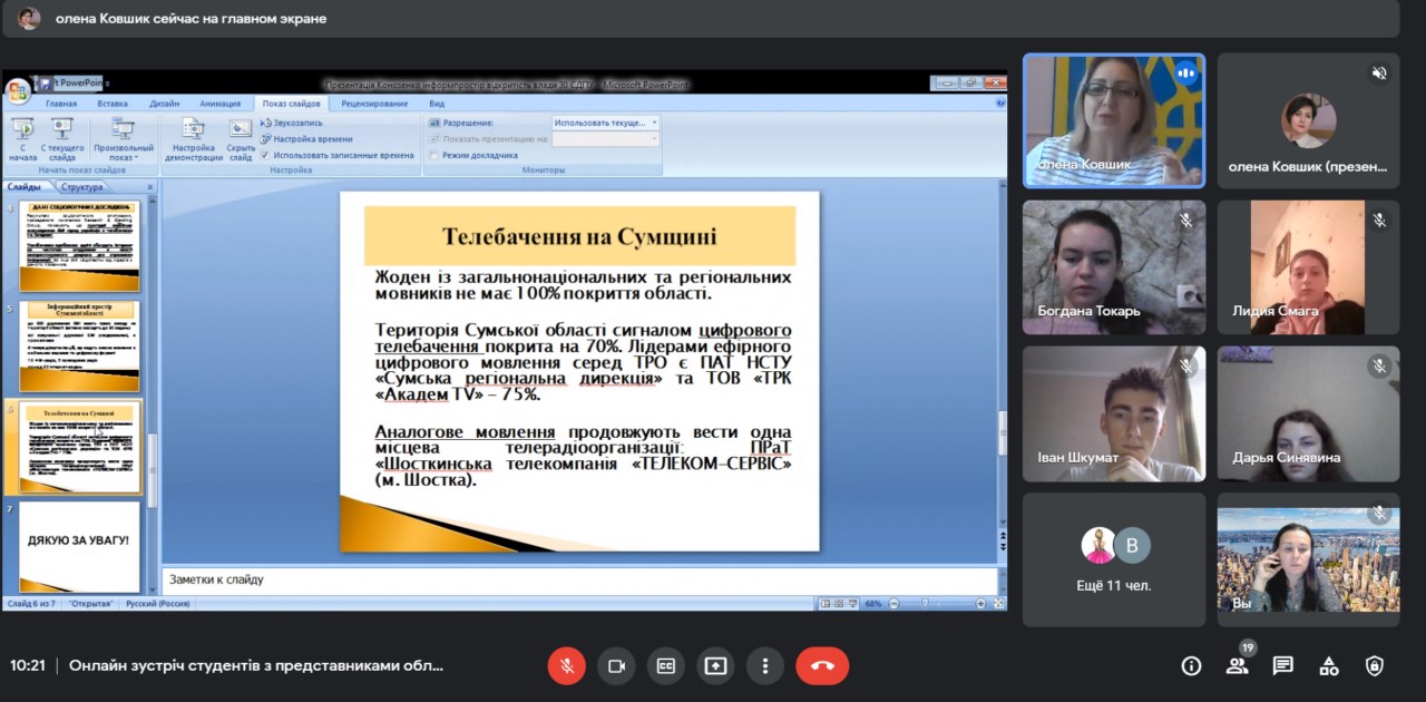 Начальник відділу з питань комунікативної політики Управління з питань розвитку інформаційного простору Департаменту інформаційної діяльності та комунікацій з громадськістю Сумської обласної державної адміністрації Людмила КОНОЗЕНКО ознайомила студентів з основними напрямками державної інформаційної політики. Працівники сектору забезпечення доступу до публічної інформації Олена КОВШИК та Інна ШУЛЬГА повідали слухачам про конституційне право кожного на доступ до публічної інформації, зокрема, розповіли як отримати інформацію на запит від суб’єктів владних повноважень, приділили значну увагу темі впровадження відкритих даних в Україні, як одного із ключових інструментів творення інформаційного суспільства.