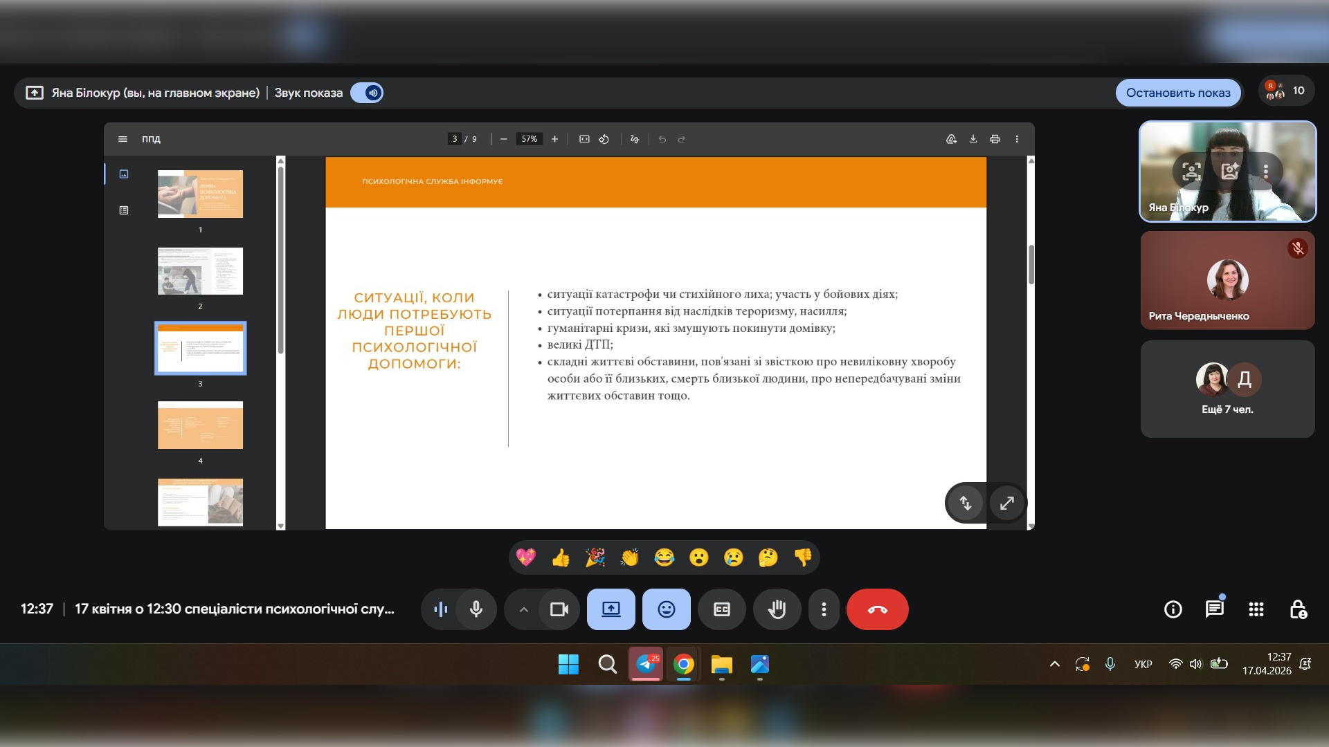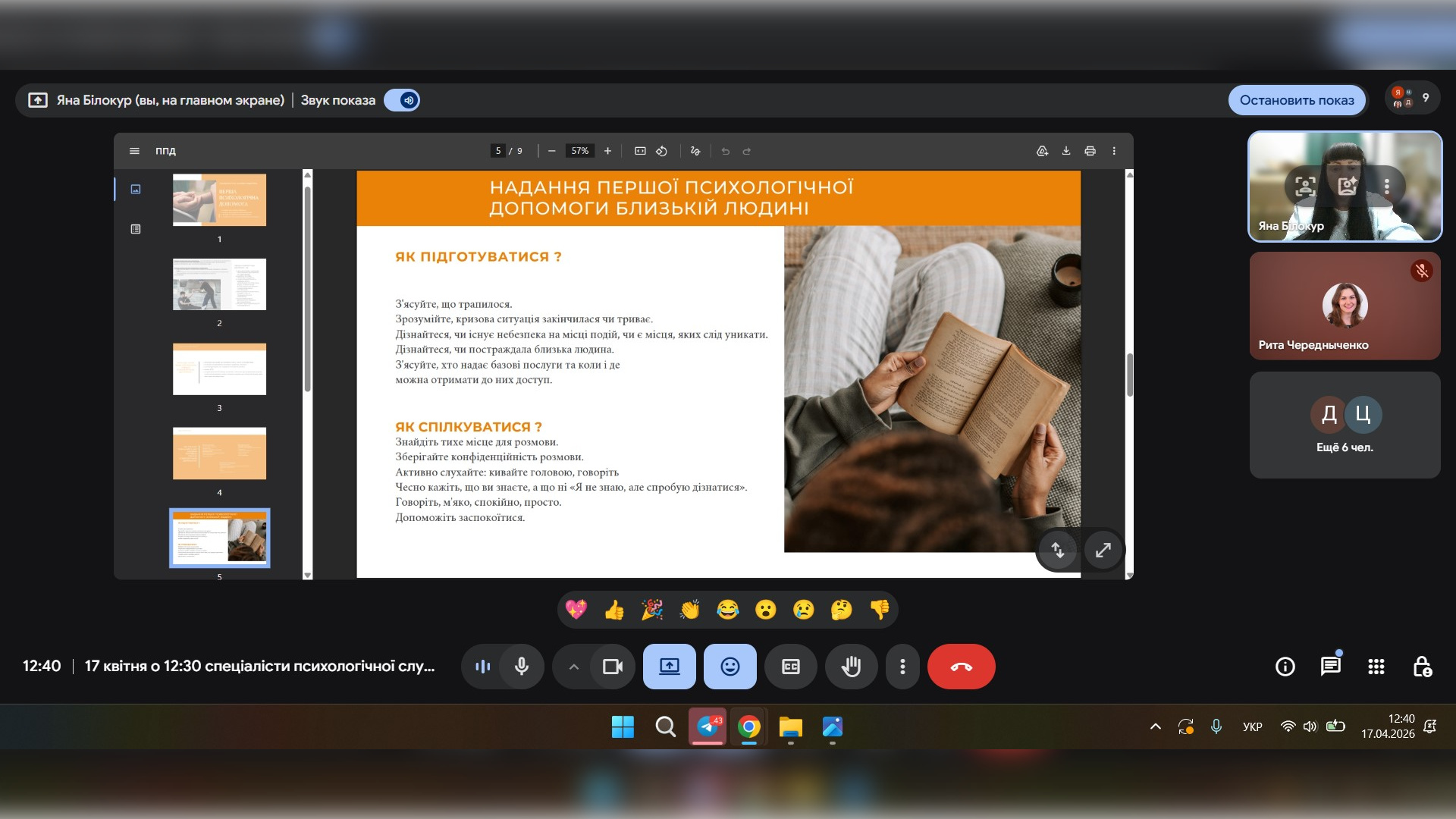 17 квітня спеціалістами Психологічної служби було проведено онлайн захід на тему: «Перша психологічна допомога», присвячений до Всесвітнього дня психолога.
