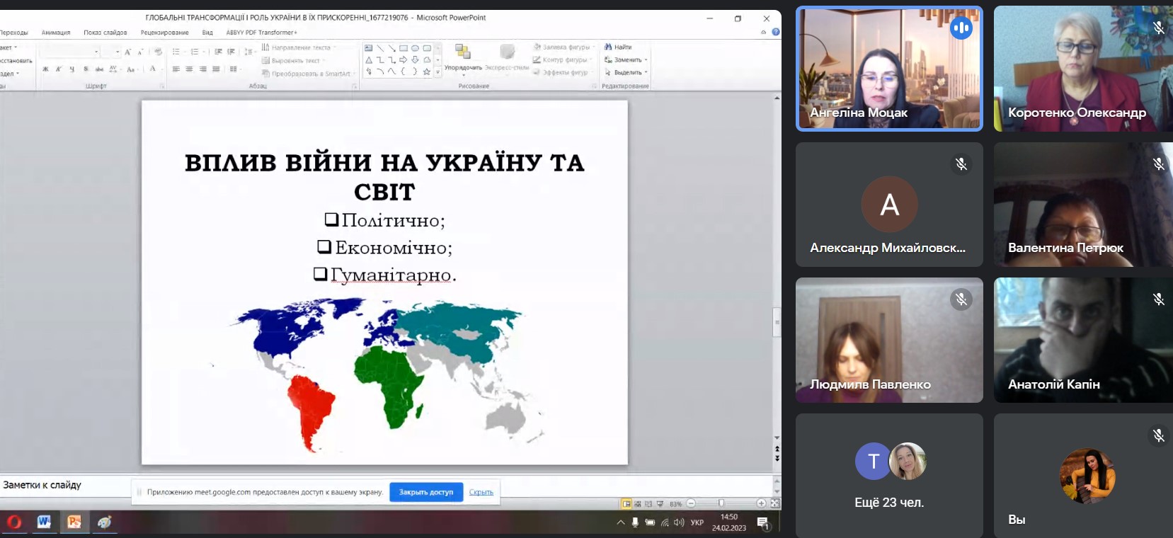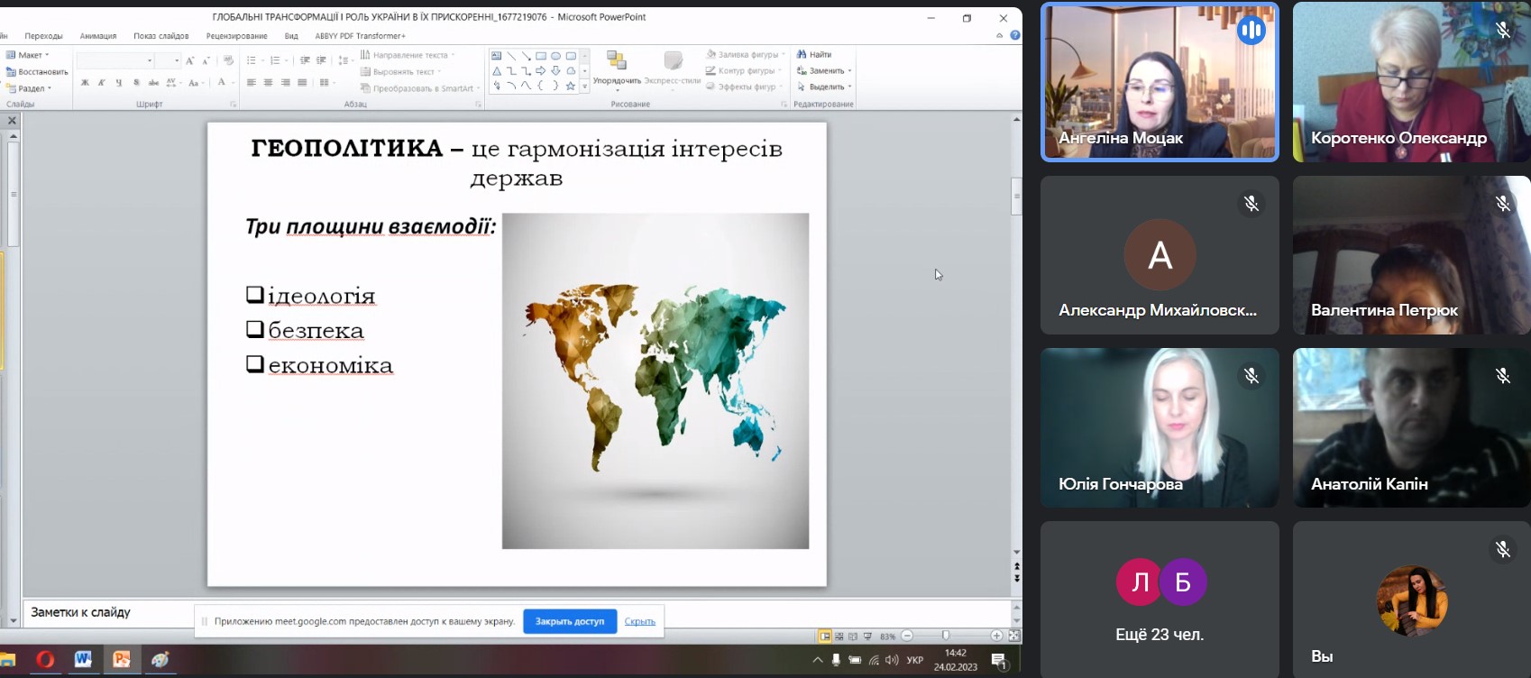 24 лютого 2023 року кафедрою всесвітньої історії, міжнародних відносин та методики навчання історичних дисциплін у співпраці з закладами професійно-технічної освіти було організовано та проведено онлайн семінар для викладачів предмета «Громадянська освіта» «Європейська інтеграція й глобалізація в сучасній геополітиці України».