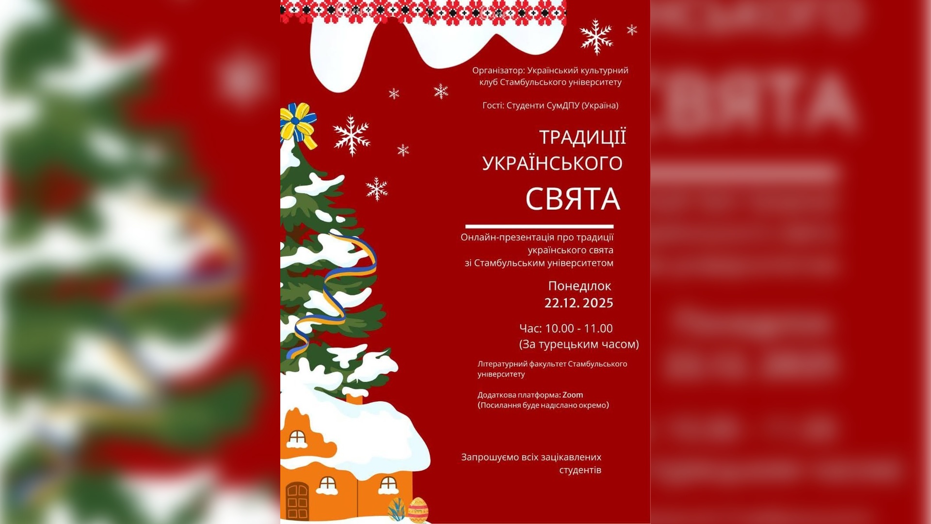 22 грудня 2025 року відбулася велика онлайн-зустріч студентської молоді СумДПУ та Стамбульського університету. Тема заходу – «Традиції українського Різдва та всесвітньо відомий «Щедрик» Миколи Леонтовича».