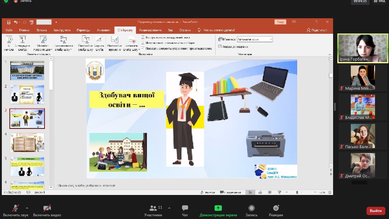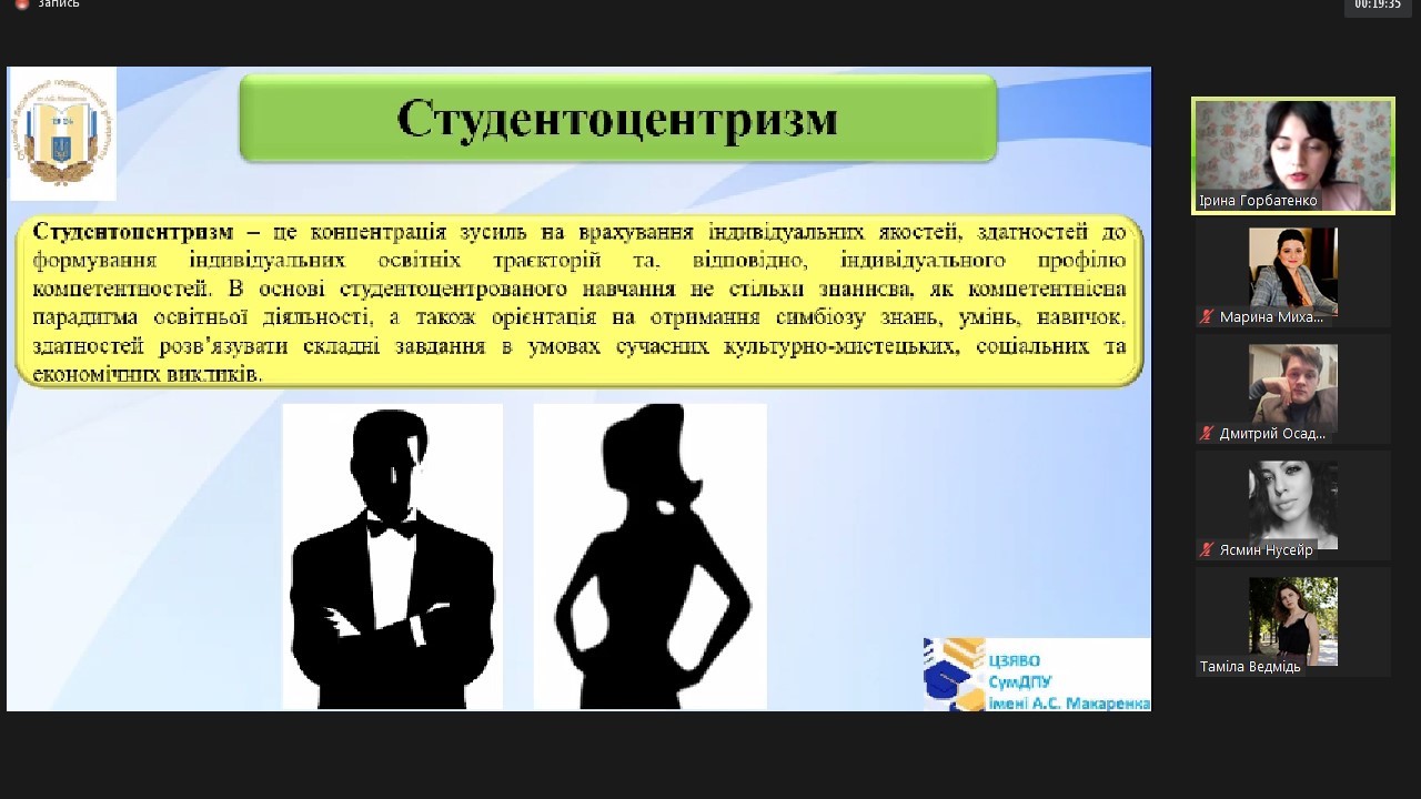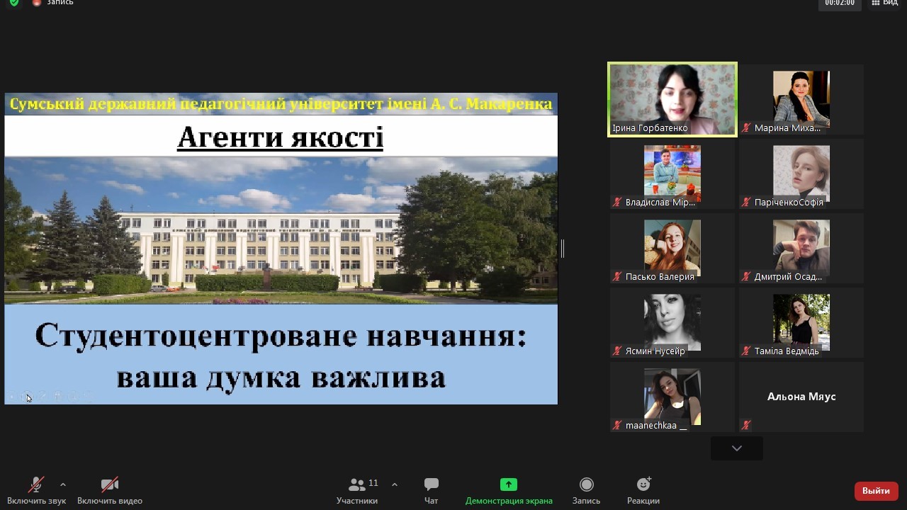 15 квітня в СумДПУ імені А.С. Макаренка відбулося перше навчальне тренінгове онлайн-заняття студентської фокус-групи «Агенти якості» під керівництвом фахівця Центру ЗЯВО, куратора фокус-групи Горбатенко І.С. на тему «Студентоцентроване навчання – сучасна парадигма вищої освіти».
