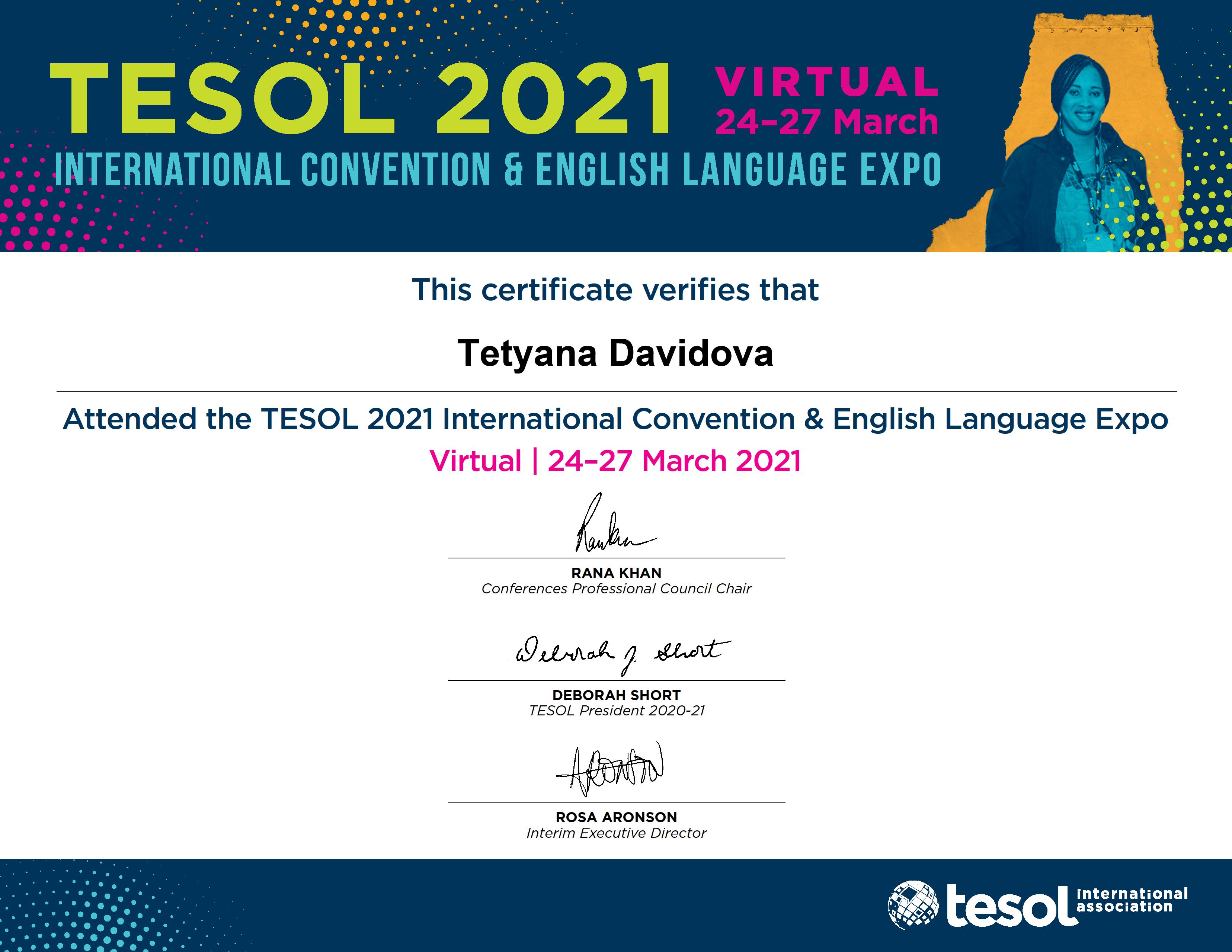24-27 березня 2021 за підтримки Корпусу Миру США в Україні викладачі кафедри практики англійської мови факультету іноземної та слов’янської філології Голубкова Н.Л. та Давидова Т.В взяли участь у роботі Міжнародної конференції (TESOL 2021 International Convention & English Language Expo).