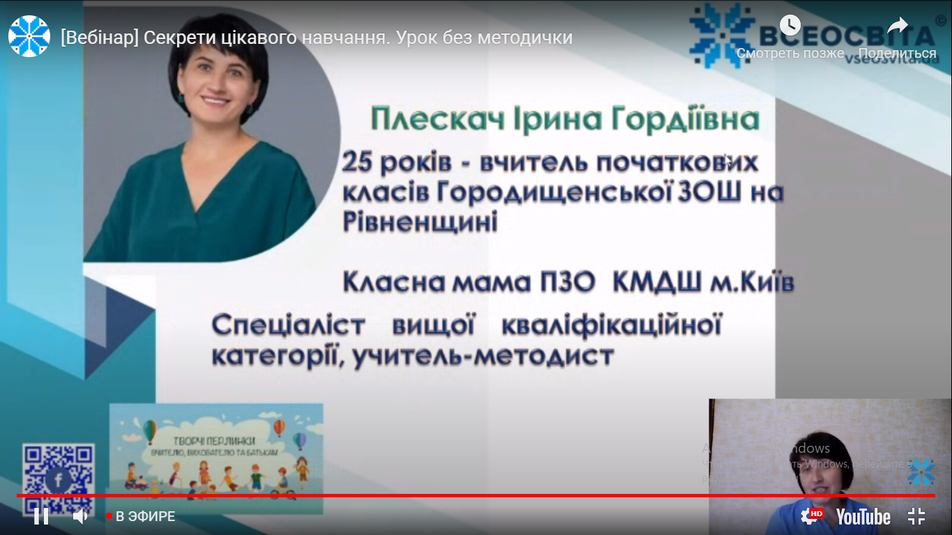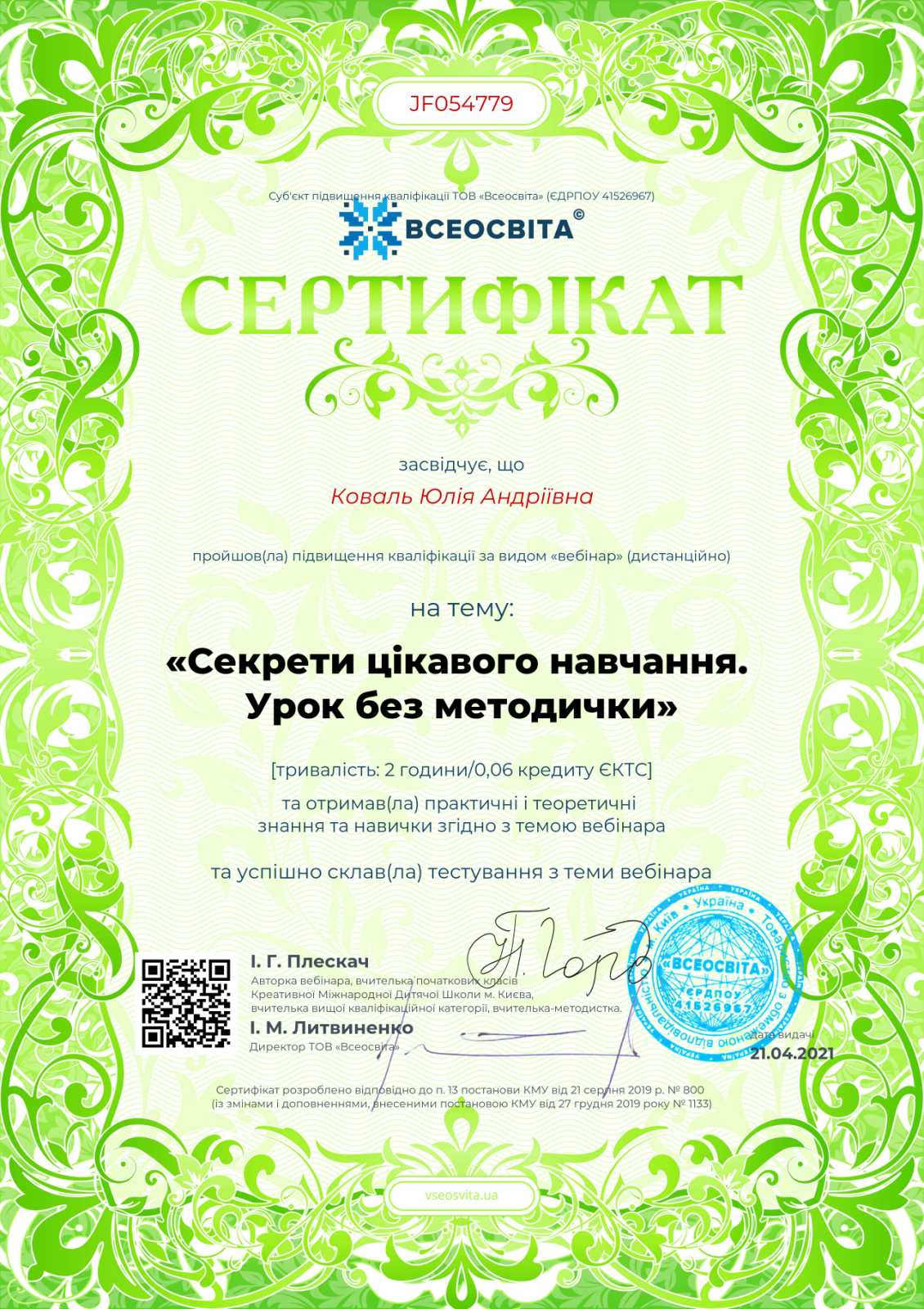 21 квітня 2021 року студентки 731 груп спеціальності 014 Середня освіта (Географія) Логвин Ганна та Коваль Юлія взяли участь в освітньому проєкті “Всеосвіта” та пройшли он-лайн вебінар «Секрети цікавого навчання. Урок без методички».