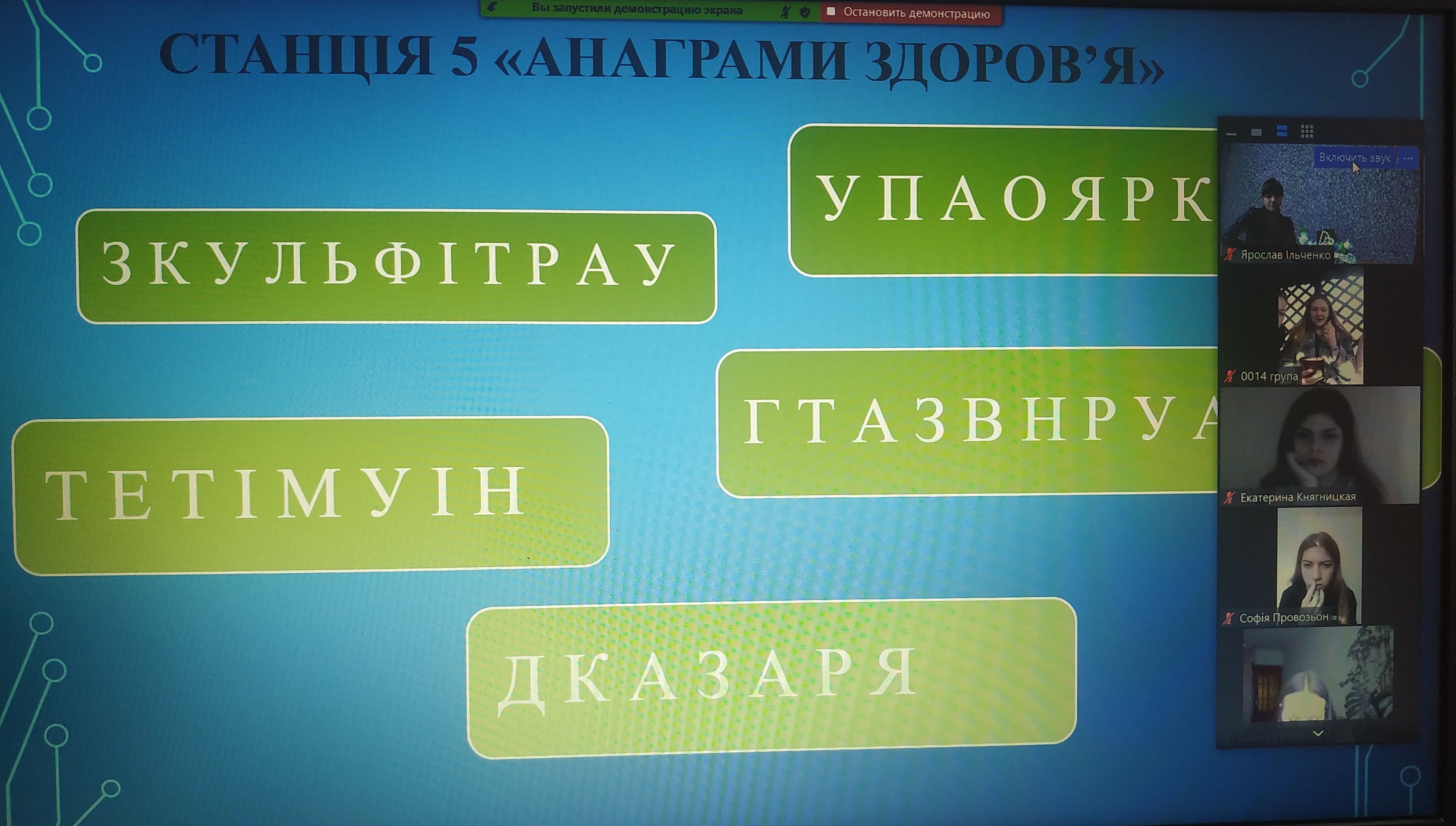 Продовжуючи серію онлайн-квестів в СумДПУ сьогодні, 22 квітня, відбувся тематичний квест "Стежками здоров'я", участь в якому взяли студенти з чотирьох структурних підрозділів нашого університету: ННІ фізичної культури, ННІ педагогіки та психології, Фізико-математичного факультету та Факультету іноземної та слов'янської філології. Протягом гри, яка складалася з 6 станцій, команди показували знання в такій актуальній, на сьогоднішній день, темі як здоров'я людини.