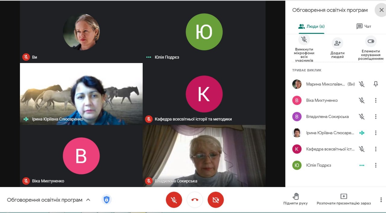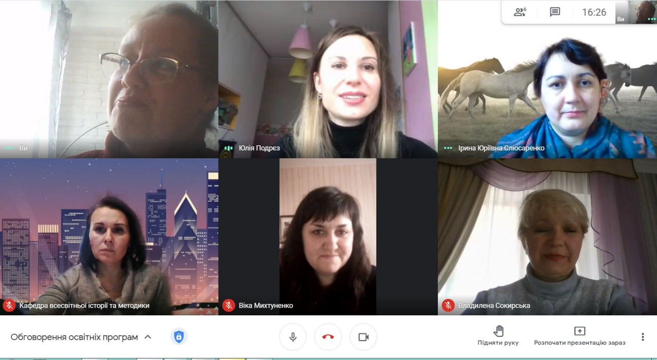 16 квітня 2021 р. на базі Навчально-наукового інституту історії, права та міжнародних відносин он-лайн зустріч адміністрації інституту (Подрєз Ю.В., директорка інституту, к.і.н., доцент; Моцак С.І., в.о. завідувача кафедри всесвітньої історії, міжнародних відносин та методики навчання історичних дисциплін, к.п.н., доц.; Сокирська В.В., д.і.н., професор кафедри кафедри всесвітньої історії, міжнародних відносин та МНІД; Михтуненко В.В., заступник директора інституту з наукової роботи, к.і.н., старший викладач) з гарантами освітніх програм «Регіональні студії» та «Суспільні комунікації» Київського університету імені Бориса Грінченка Бессоновою М.М. (к.і.н., доцент кафедри міжнародних відносин та міжнародного права) та Слюсаренко І.Ю. (к.і.н., доцент кафедри міжнародних відносин та міжнародного права).