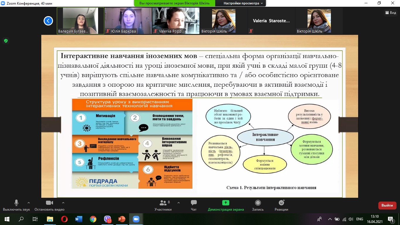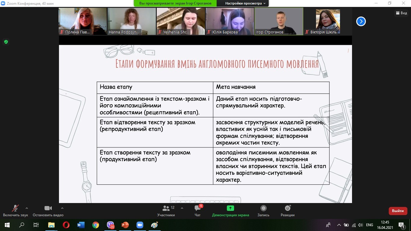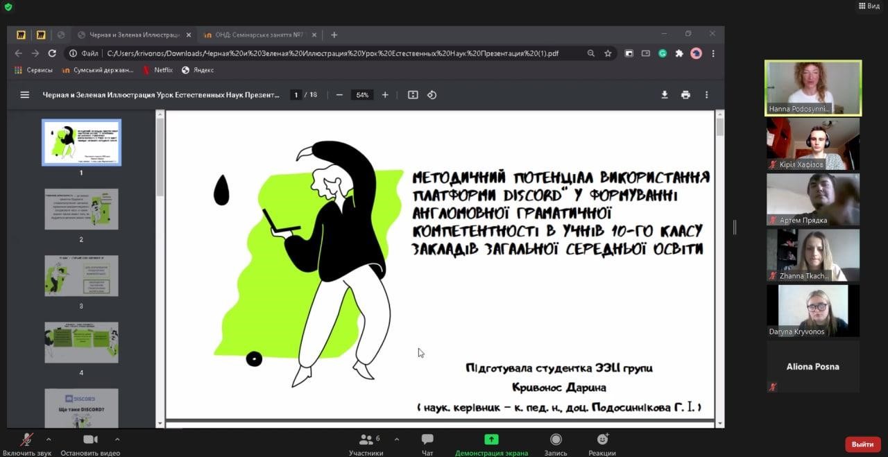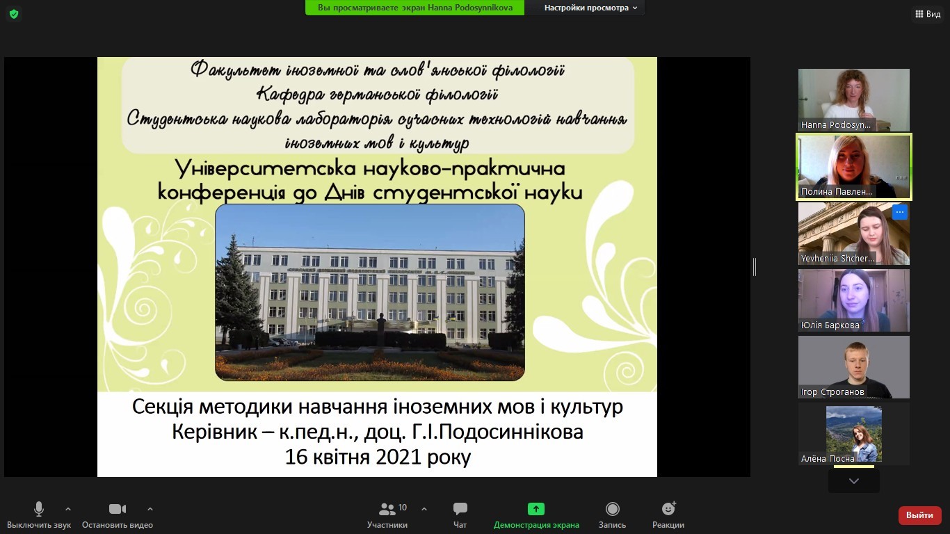 На факультеі іноземної та слов’янської філології у межах Університетської науково-практичної конференції до Днів студентської науки 16-го квітня відбулося он-лайн засідання секції методики викладання іноземних мов і культур кафедри германської філології, яке організувала Студентська наукова лабораторія методики навчання іноземних мов і культур та Міжуніверситетська науково-дослідна лабораторія сучасних технологій навчання іноземних мов і культур (керівник – к.пед.н.доц. Подосиннікова Г.І.).