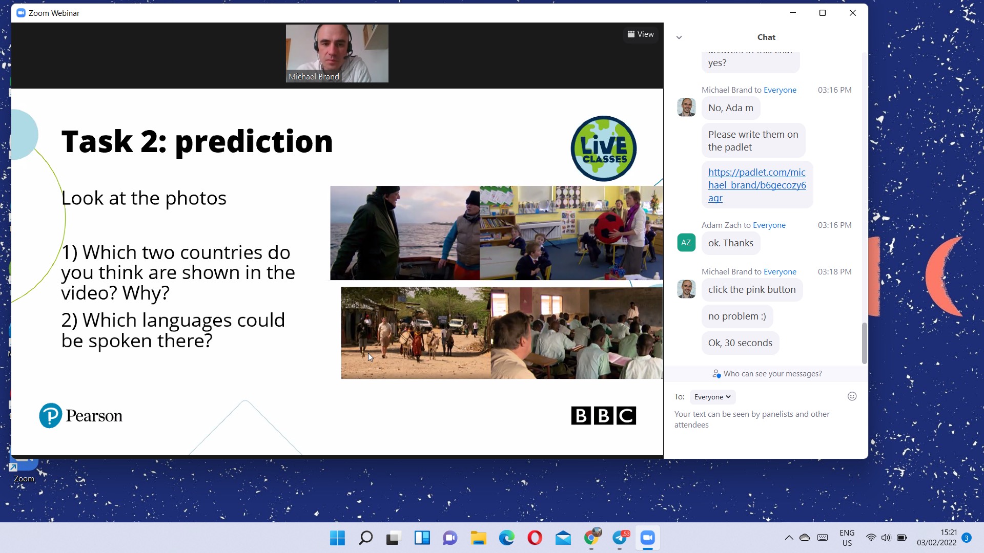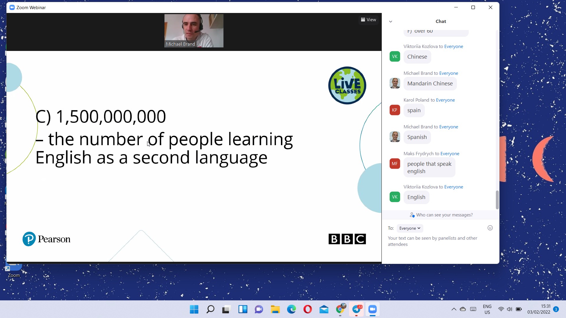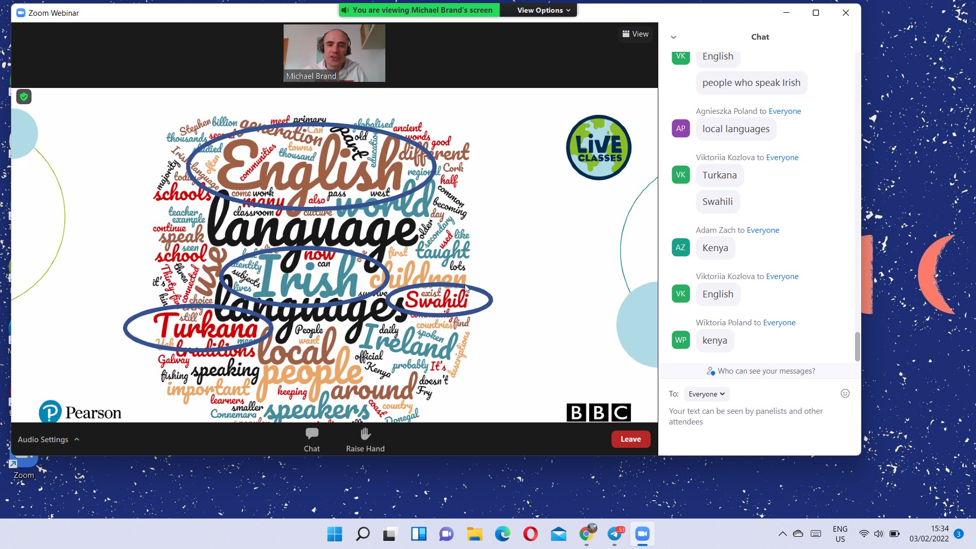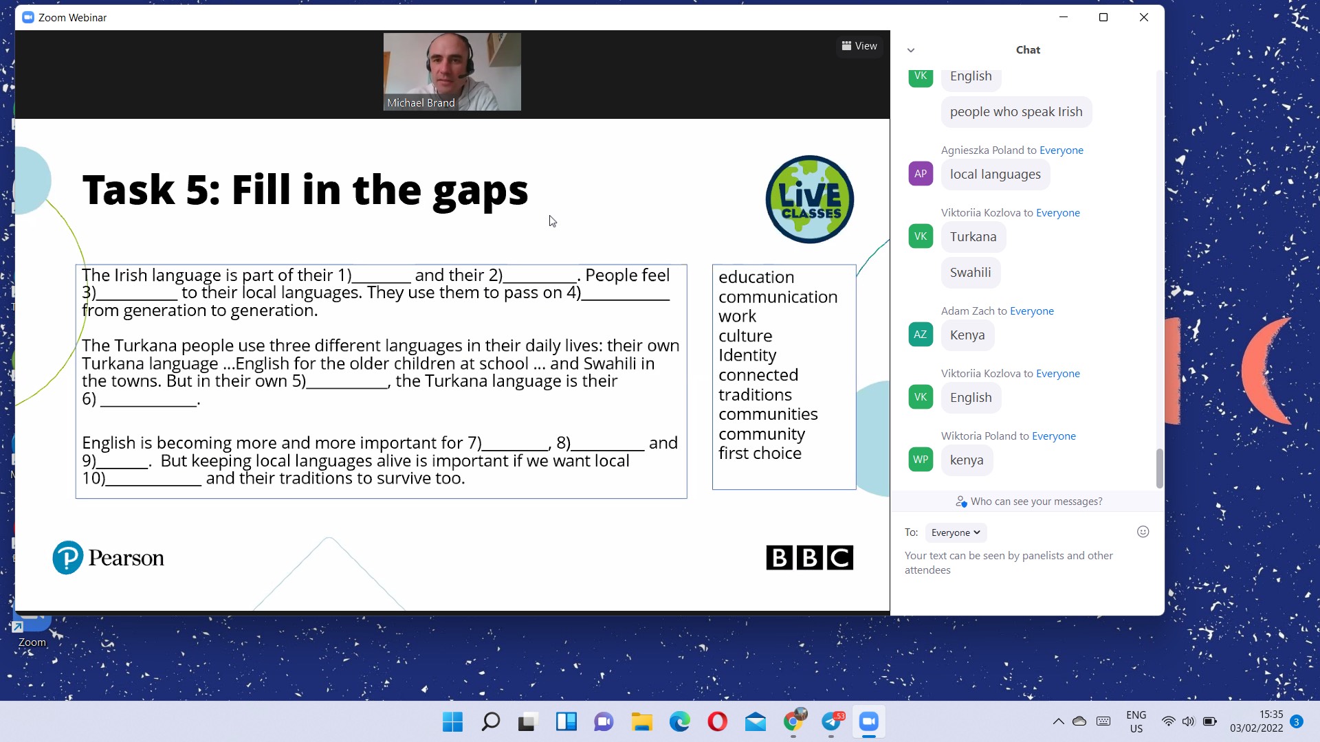Так 3 лютого 2022 р. в межах вивчення теми «ENGLISH AS A WORLD LANGUAGE» - ОК «ПРАКТИКА УСНОГО ТА ПИСЕМНОГО АНГЛІЙСЬКОГО МОВЛЕННЯ» студенти 331.2 групи (викл. Козлова В.В.) стали учасниками Big Live Lesson – тема: «Celebrating languages» організованих Pearson and BBC. Зі спікером @Michael Brand обговорювали перспективи вивчення англійської мови і її статус та впливовiсть у світі, загрози зникнення місцевих мов в контексті глобалізації, виконували різноманітні завдання, переглядали відео «Keeping Languages Alive» BBC, працювали з онлайн дошкою padlet і навіть навчили іноземних студентів ключовим українським фразам. На занятті панувала дружня, сприятлива атмосфера, а після закінчення залишилися приємні та позитивні враження. З нетерпінням чекаємо на нові зустрічі!