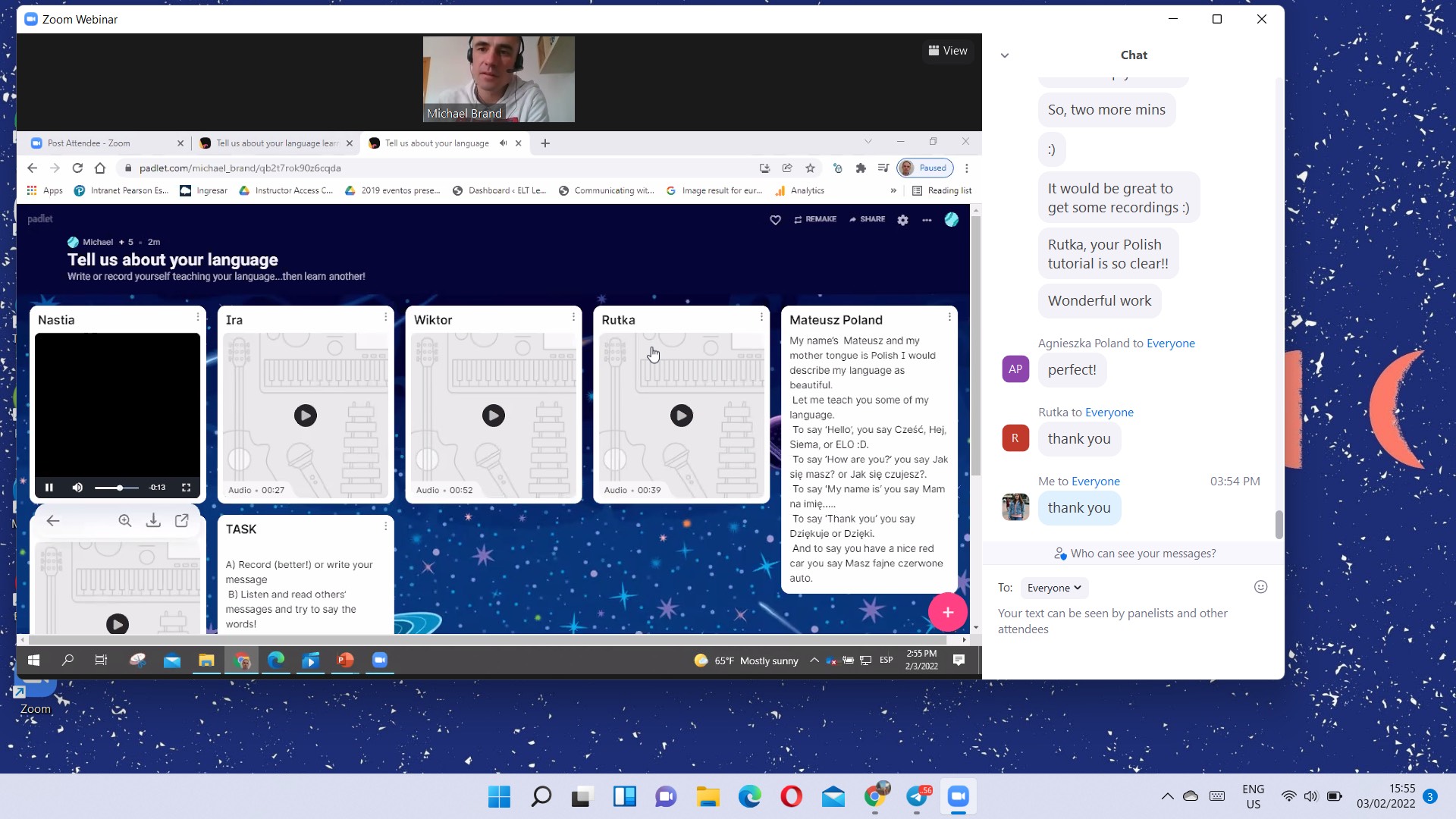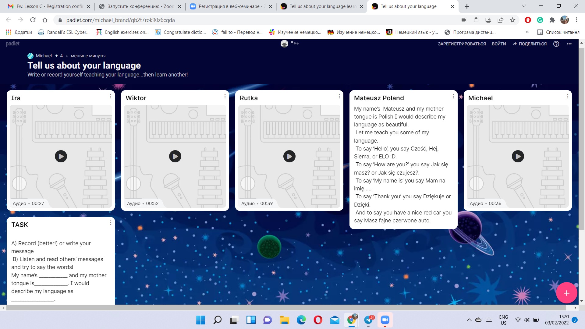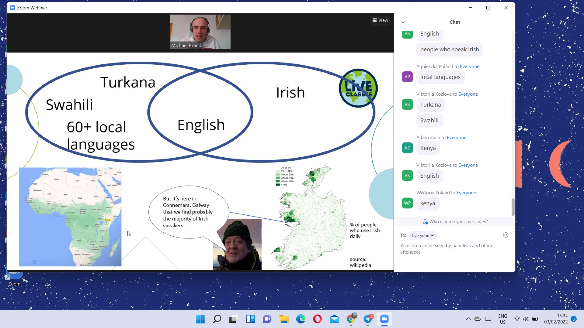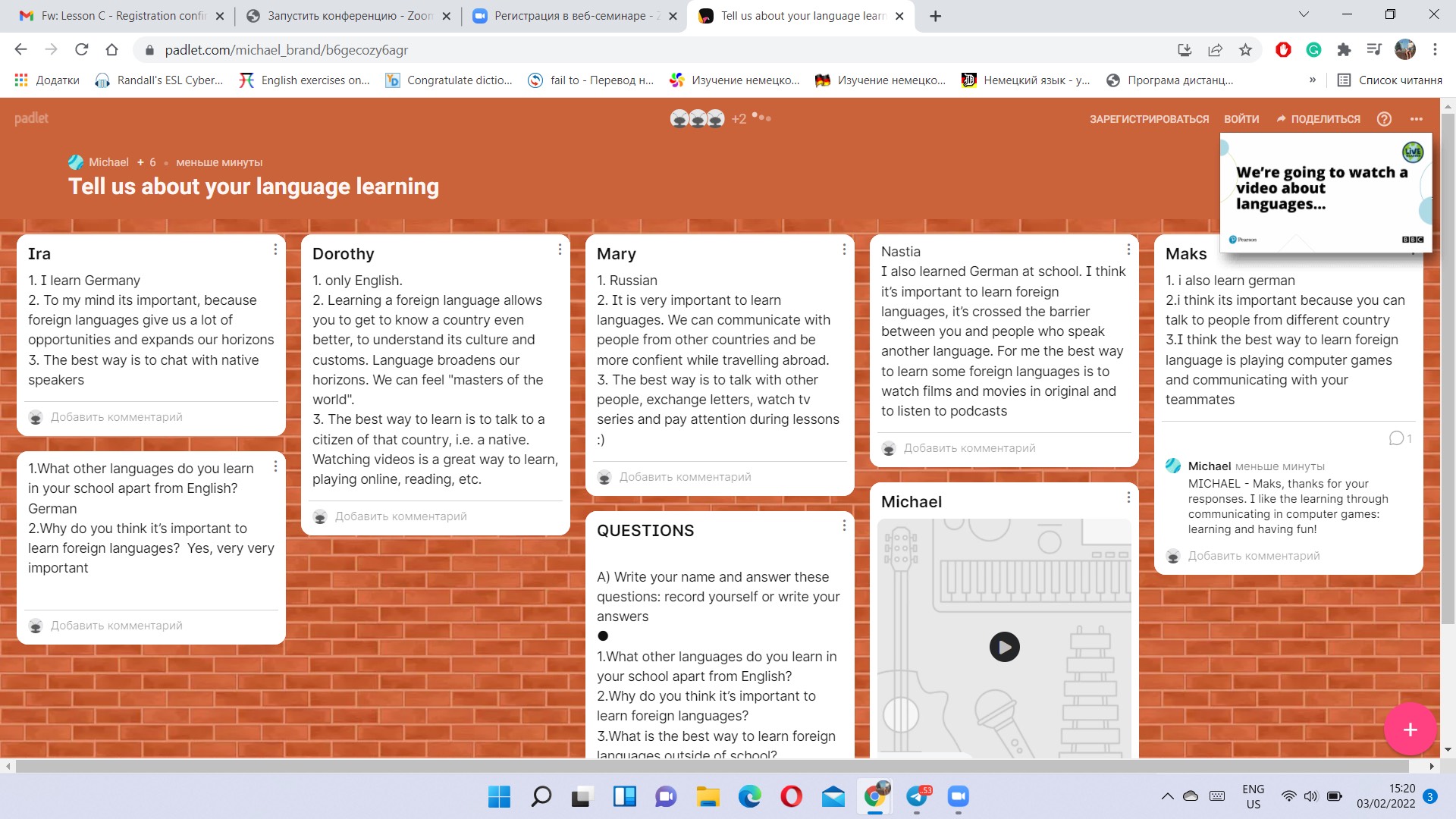 Так 3 лютого 2022 р. в межах вивчення теми «ENGLISH AS A WORLD LANGUAGE» - ОК «ПРАКТИКА УСНОГО ТА ПИСЕМНОГО АНГЛІЙСЬКОГО МОВЛЕННЯ» студенти 331.2 групи (викл. Козлова В.В.) стали учасниками Big Live Lesson – тема: «Celebrating languages» організованих Pearson and BBC. Зі спікером @Michael Brand обговорювали перспективи вивчення англійської мови і її статус та впливовiсть у світі, загрози зникнення місцевих мов в контексті глобалізації, виконували різноманітні завдання, переглядали відео «Keeping Languages Alive» BBC, працювали з онлайн дошкою padlet і навіть навчили іноземних студентів ключовим українським фразам. На занятті панувала дружня, сприятлива атмосфера, а після закінчення залишилися приємні та позитивні враження. З нетерпінням чекаємо на нові зустрічі!