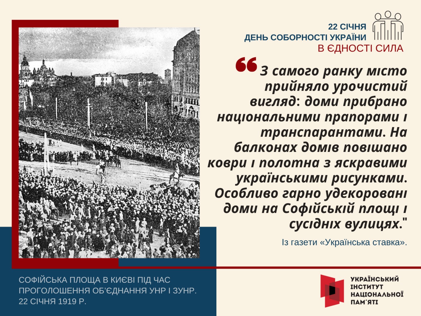 Більш детально з історією свята можна ознайомитися на сайті Українського інституту національної пам’яті - https://uinp.gov.ua/informaciyni-materialy/zhurnalistam/informaciyni-materialy-do-dnya-sobornosti-ukrayiny-2021