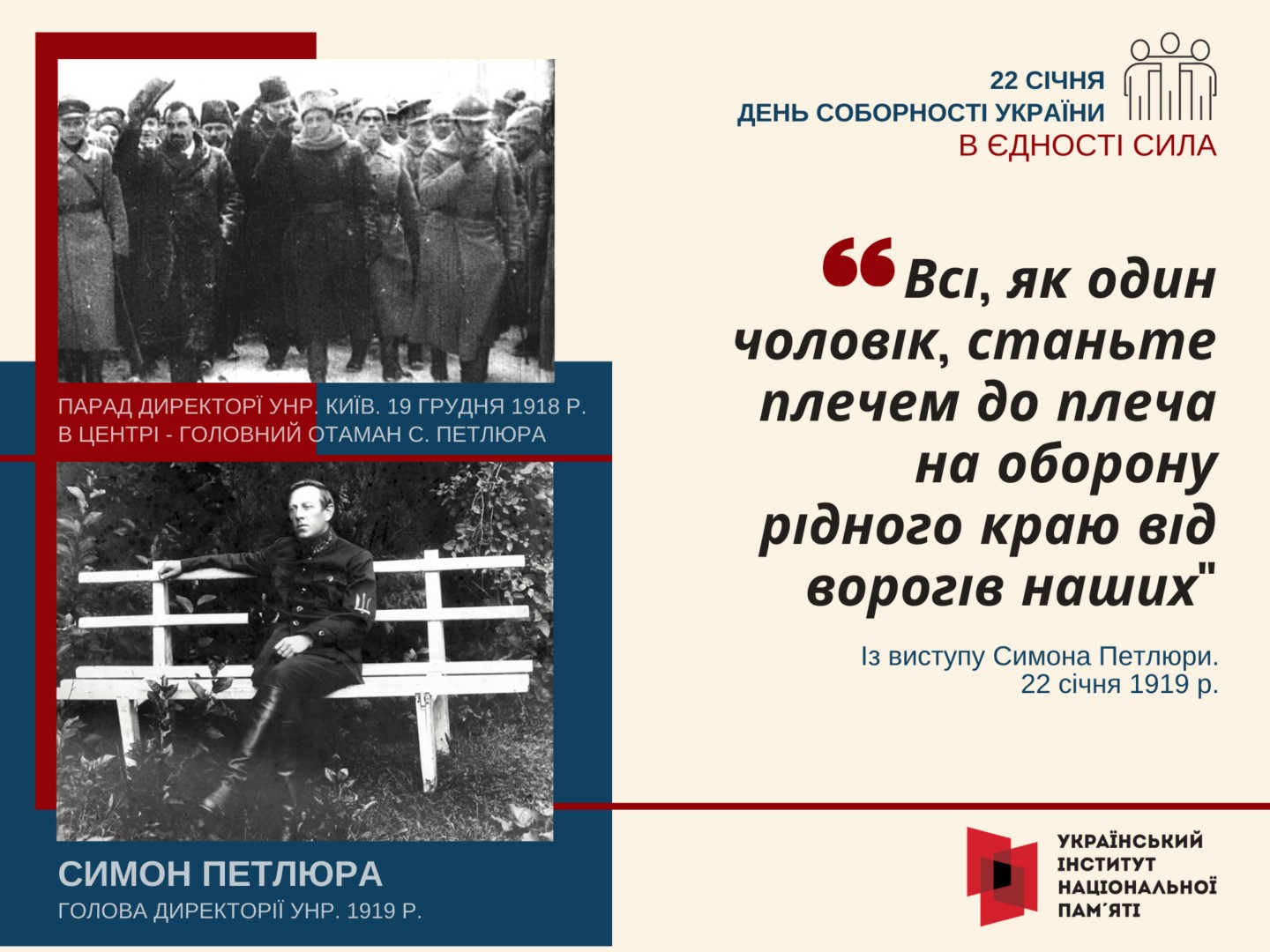Вперше у XX столітті українська незалежність була проголошена 22 січня 1918 року IV Універсалом Української Центральної Ради, а вже за рік (22 січня 1919 року) на Софійському майдані в Києві відбулася не менш вагома подія – об’єднання Української Народної Республіки і Західноукраїнської Народної Республіки в одну державу.