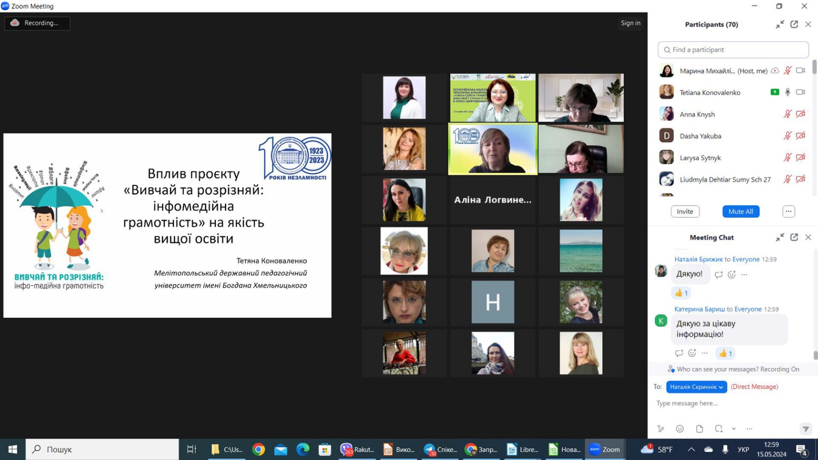 Панельна дискусія була побудована таким чином, щоб відстежити взаємовпливи подвійної імплементації програми “Вивчай і розрізняй: інфомедійна грамотність в освіті” на рівні “ЗВО-ЗЗСО-ЗПДО” протягом 2019-2024 рр. на основі розробки робочих навчальних програм, тренінгів, майстер-класів, підручників тощо. Із практикозорієнтованими доповідями виступили: Олена Семеног (СумДПУ імені А.С. Макаренка) “Культуромовна особистість молоді у проєкції розвитку на засадах інфомедійної грамотності (досвід грантових проєктів кафедри УМЛ СумДПУ)”, Олена Ісаєва (УДУ імені Михайла Драгоманова) “Критичний аналіз медіатекстів як необхідна метанавичка сучасної особистості”, Тетяна Коноваленко (МДПУ імені Богдана Хмельницького) “Вплив проєкту “Вивчай і розрізняй: інфомедійна грамотність на якість вищої освіти” “, Світлана Моцак (СумДПУ імені А.С. Макаренка) “Діджиталізація освітнього процесу в умовах воєнного стану як основа формування критичного мислення та аналітичних навичок у майбутніх вчителів історії”, Наталія Громова (СумДПУ імені А.С. Макаренка) “Використання штучного інтелекту на уроках мовнолітературної галузі (на прикладі нейромереж Ideogram та Bing)”, Максим Запорожченко, (Миколаївський обласний інститут післядипломної освіти, Академія української преси) “Стратегічні напрями розвитку медіаосвіти на Миколаївщині”, Лариса Ситник, (Комунальний заклад Сумський обласний інститут післядипломної педагогічної освіти) “Впровадження медіаосвіти для педагогів Сумщини”, Вадим Пилипенко (Полтавська академія неперервної освіти ім. М.В. Остроградського (IREX) “Інфомедійна грамотність в ПАНО ім. М.В. Остроградського”.