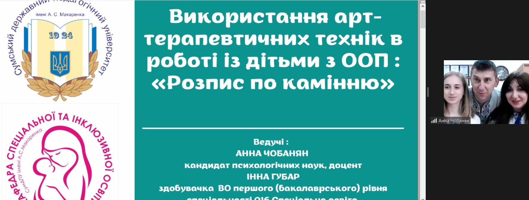 ПЛАТФОРМА 3 – Майстер-клас: «Використання арт-терапевтичних технологій в роботі з дітьми з ООП» (платформа Zoom) (Анна Чобанян, кандидат психологічних наук, доцент; Інна Губар, здобувачка спеціальності 016 Спеціальна освіта, третього року навчання, Сумський державний педагогічний університету імені А.С. Макаренка, м. Суми, Україна).