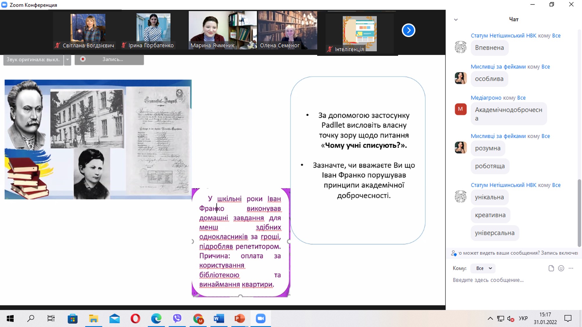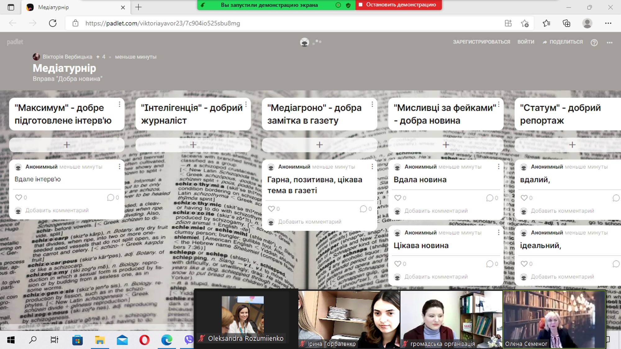 Коворкінг «Майстерня медіаграмотності» поєднав у собі цікаві онлайн-вправи та завдання, які сподобалися командам. Зокрема, Семеног О.М. познайомила учнів із «Українським лінгвістичним порталом», де можна знайти будь-яке слово в онлайн-словнику, за допомогою онлайн-дошки «Padlet» учасники турніру добирали під час вправи «Добра новина» асоціації до різних словосполучень із лексемою «добрий», розмірковували, який зміст має те чи інше слово в різних контекстах, а також розглянули журналістські стандарти.