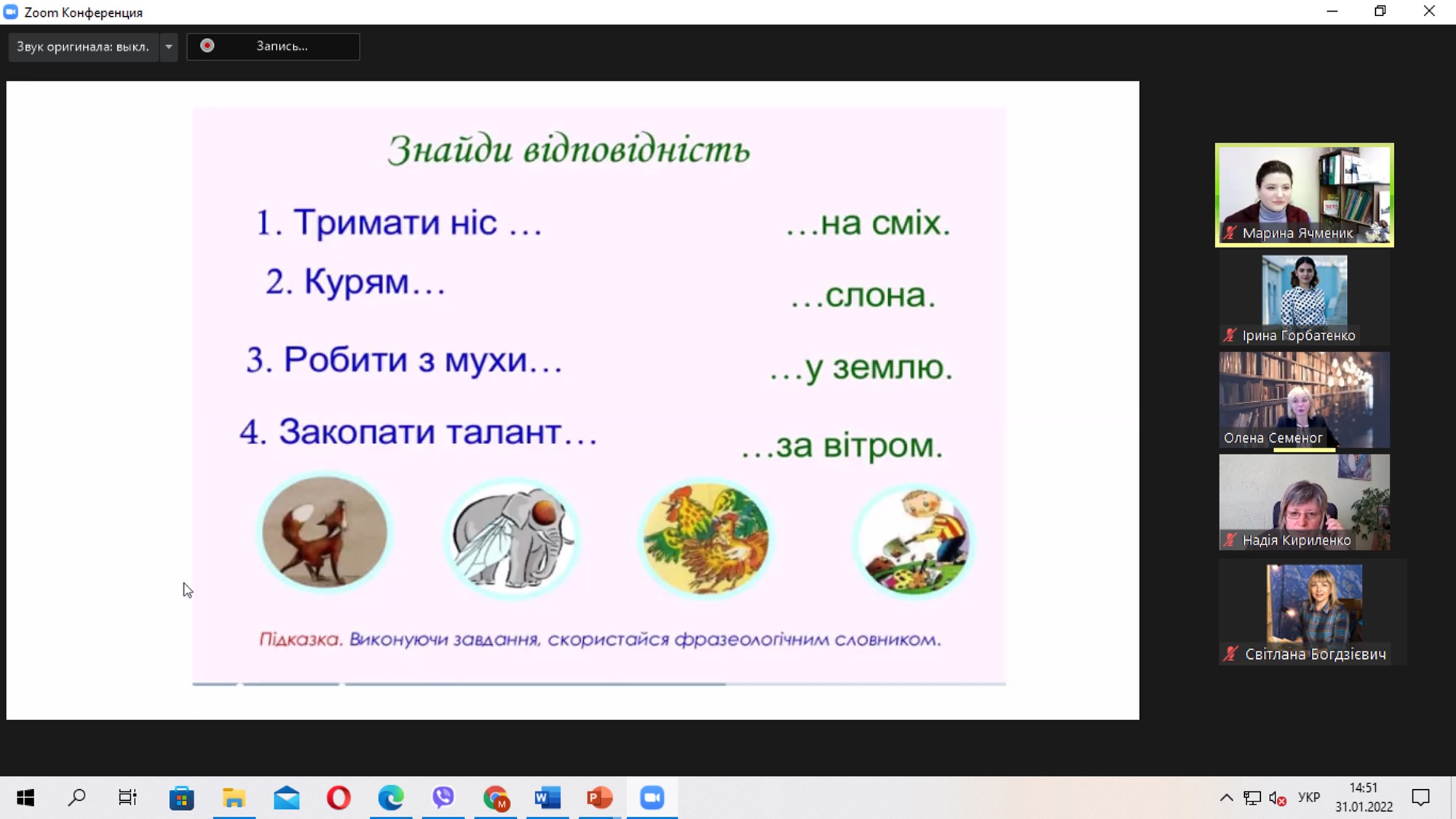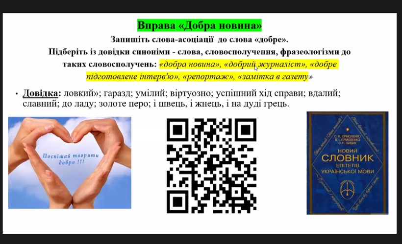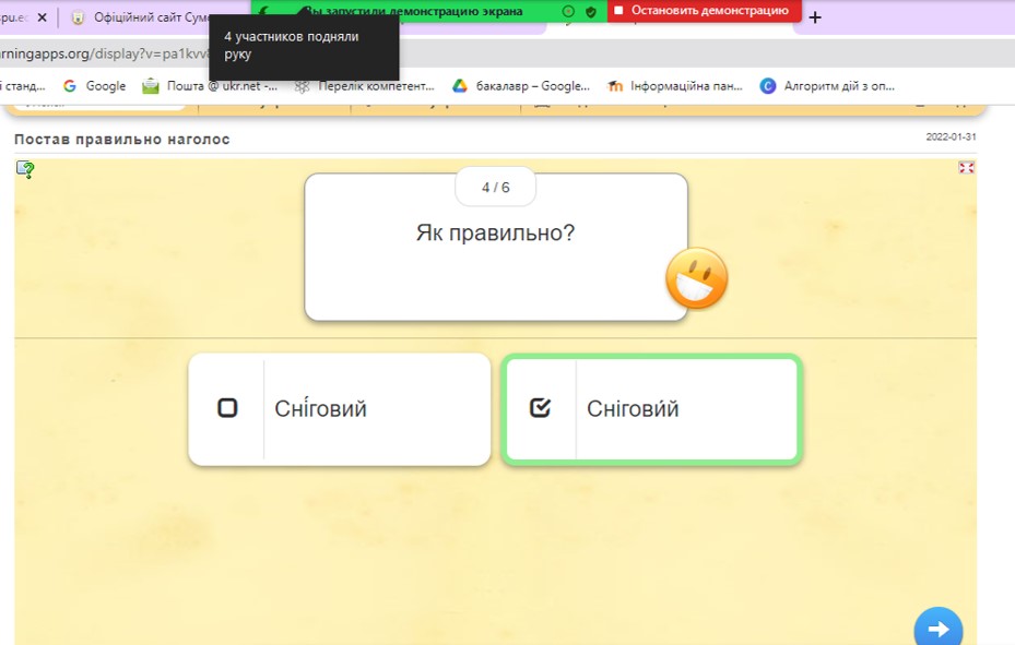 За допомогою онлайн-платформи «LearningApps» учні розставляли наголоси у словах, під час вправи «Інтонація» майстерно читали вислови з різним емоційним вираженням, утворювали фразеологізми і з’ясовували їх значення. При виконанні вправи «Медіатерміни» коментували що означають поняття «мишка», «вірус», «равлик», «хмарка», «лід», ознайомилися з базовими навичками роботи