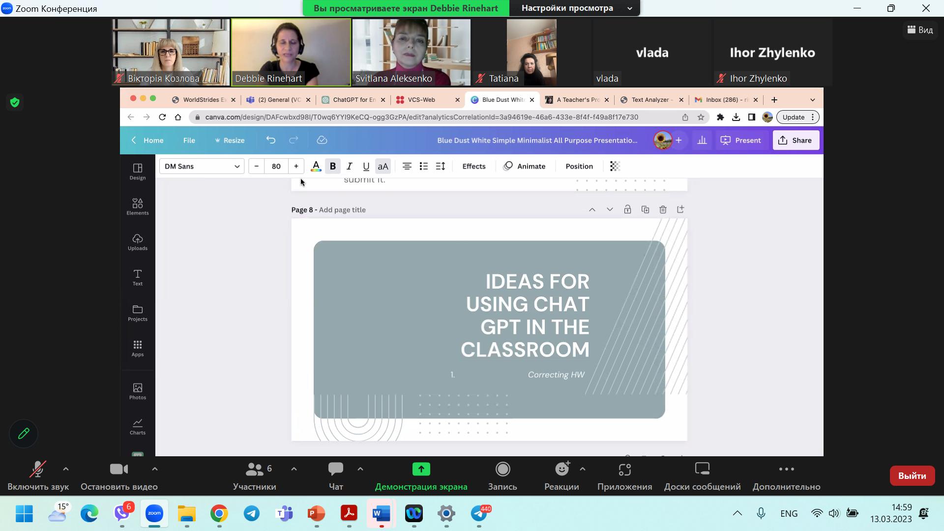 Деббі Райнхарт презентувала НПП кафедри англійської філології та лінгводидактики, а також здобувачам ОП спеціальності 014 Середня Освіта. Мова і література (англійська), алгоритм роботи з GPT, надала практичні рекомендації використання чат боту для створення завдань спрямованих на формування та удосконалення іншомовної лексичної й граматичної компетентностей. А також продемонструвала комплекс вправ безпосередньо згенерований штучним інтелектом для роботи з текстами різних жанрів. Учасники вебінару брали участь в обговоренні переваг та перспектив застосування GPT при вирішенні професійних завдань, а також мали нагоду власноруч спробувати можливості боту. І отримали цікавий і корисний досвід від плідної взаємодії.