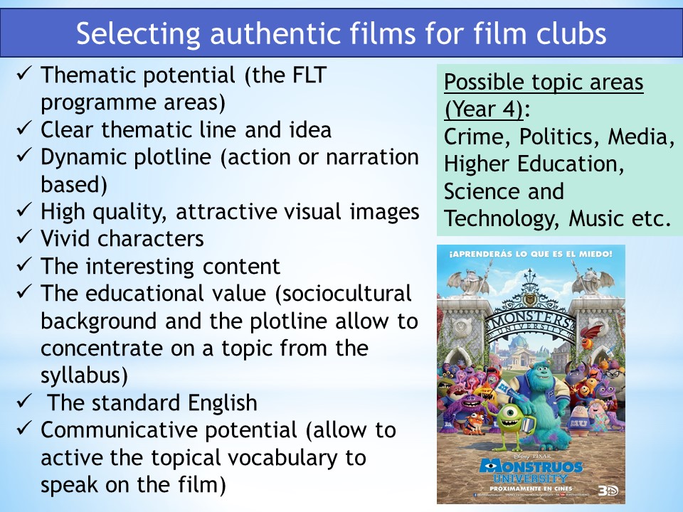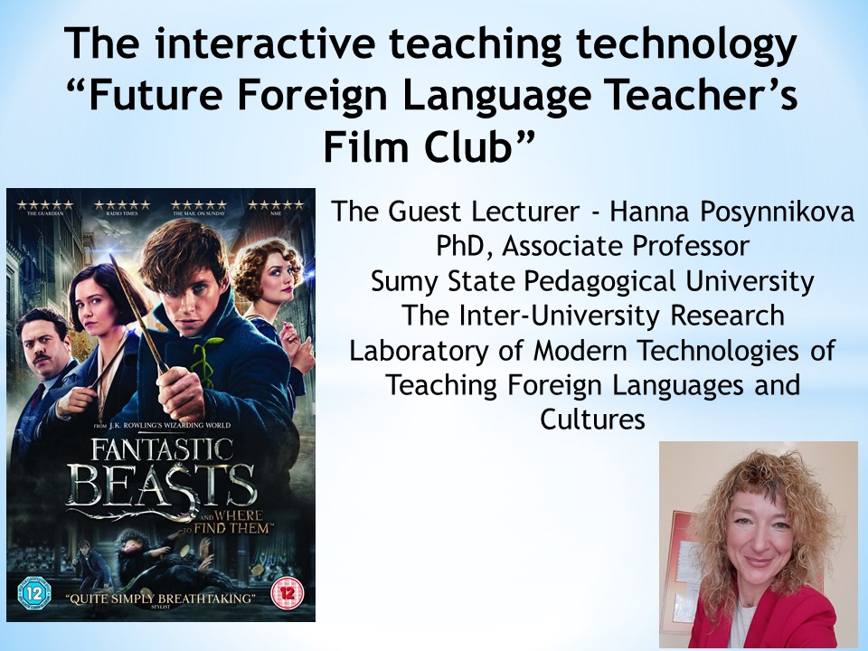 Після зустрічі на онлайн занятті-тренінгу методичної майстерні «English Teacher’s Film Club», який організували для студентів, аспірантів, викладачів СумДПУ імені А.С.Макаренка та КНЛУ Міжуніверситетська науково-дослідна лабораторія сучасних технологій навчання іноземних мов і культур та її структурний підрозділ Студентська наукова лабораторія методики навчання іноземних мов і культур (керівник – к.пед.н., доцент Г.І.Подосиннікова) кафедри англійської філології та лінгводидактики факультету іноземної та слов’янської філології, гості з КНЛУ захотіли дізнатися про методичні засади цієї цікавої навчальної технології.
