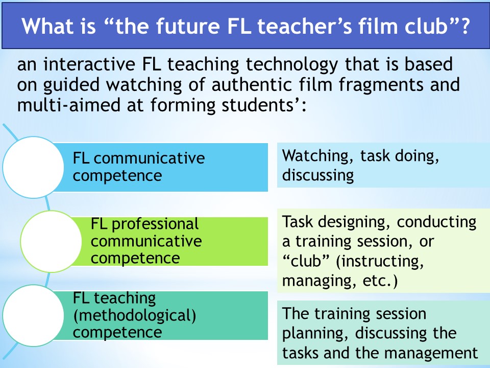 Тож на онлайн лекції здобувачі освіти КНЛУ (студенти бакалаврату та магістратури спеціальності 014 Освіта, а також аспіранти спеціальності 011 Освітні, педагогічні науки) ознайомилися з розробленою Г.І.Подосинніковою методикою: інтерактивною навчальною технологією «кіноклуб вчителя іноземної мови» («Foreign Language Teacher’s Film Club»), яка спрямована на формування професійної компетентності майбутніх учителів і викладачів англійської мови, та її різновидом – інтерактивною технологією «іншомовний кіноклуб» («Foreign Language Film Club»), яка втілюється за авторською методикою на заняттях-тренінгах з метою комплексного удосконалення професійно-методичної та іншомовної комунікативної компетентності майбутніх учителів / викладачів англійської мови.
