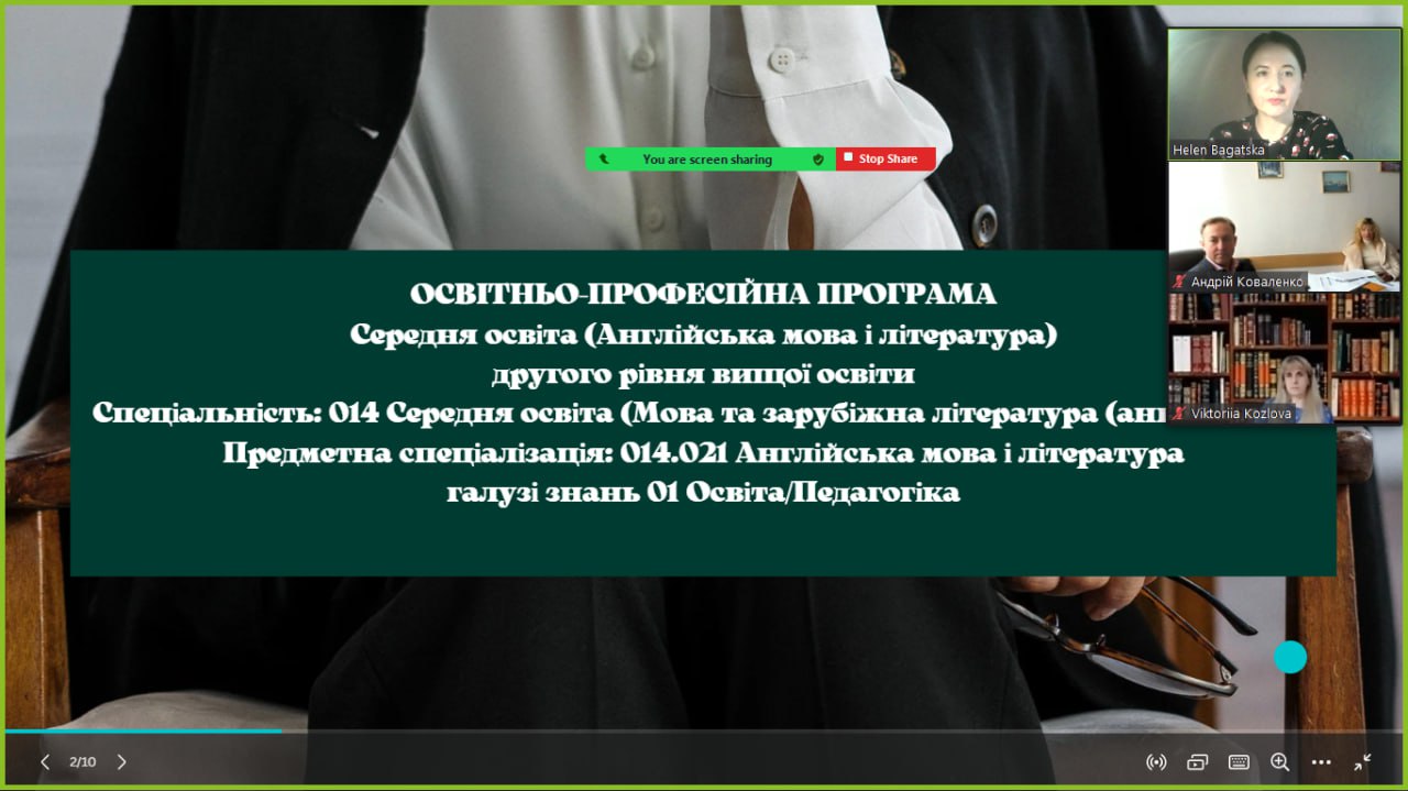 Мова та зарубіжна література (англійська) освітнього рівня Магістр – Середня освіта (Англійська мова і література) канд. філол. наук, доц. Багацької О.В. із членами робочої групи – колегами кафедри англійської філології та лінгводидактики: деканом факультету, канд. філол. наук, доц. Коваленком А.М., завідувачем кафедри англійської філології та лінгводидактики, канд. пед. наук, доц. Подосинніковою Г.І., розробником ОПП канд. філол. наук, доц. Козловою В.В.