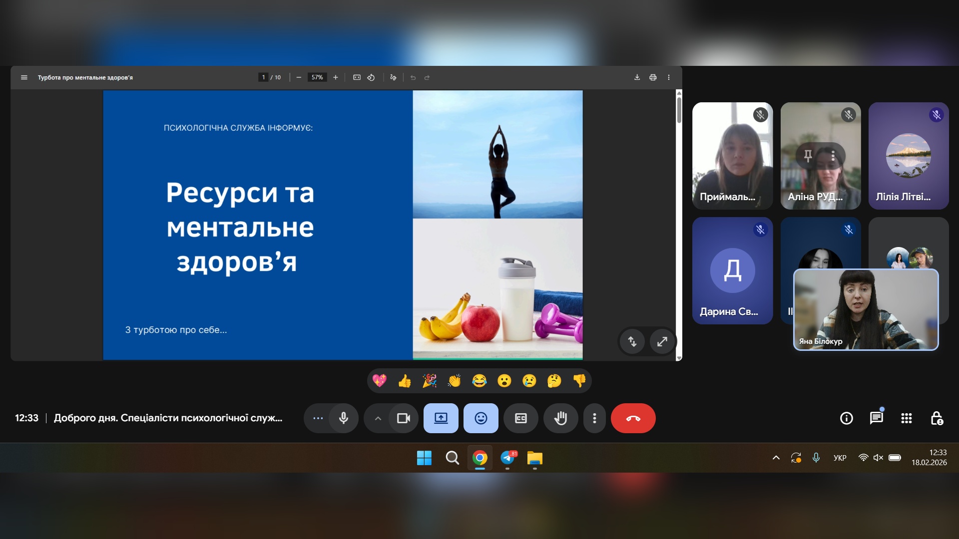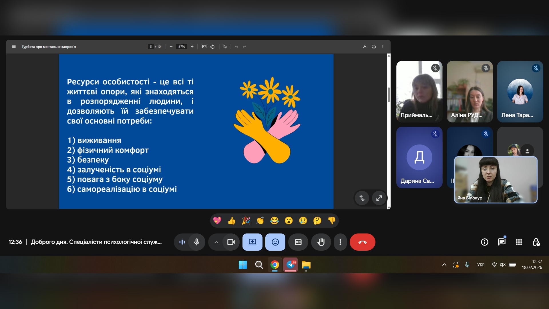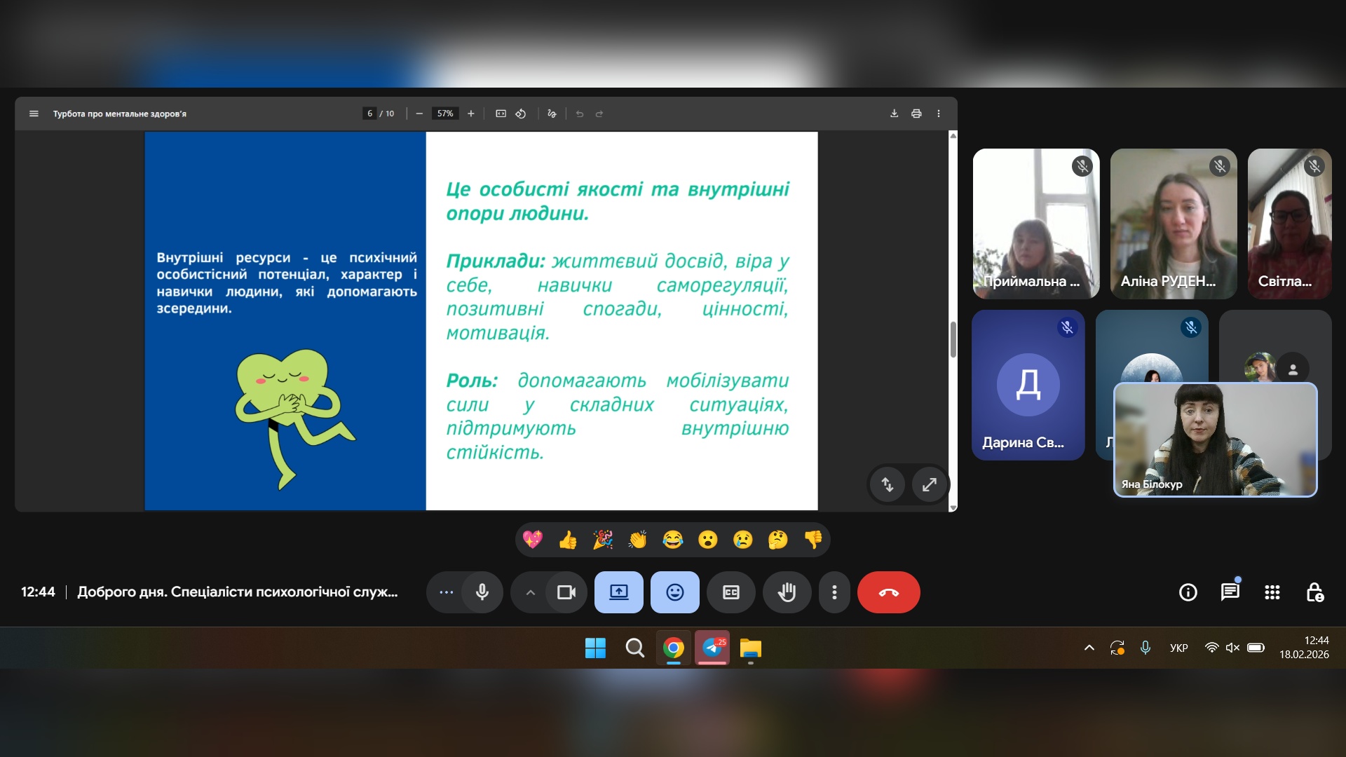 18 лютого спеціалісти психологічної служби провели онлайн-захід: «Ресурси та ментальне здоров'я», де учасники зустрічі мали змогу дізнатися більше інформації про ментальне здоров'я, ресурси та як розпізнавати й використовувати власні сили для подолання стресу та життєвих криз.