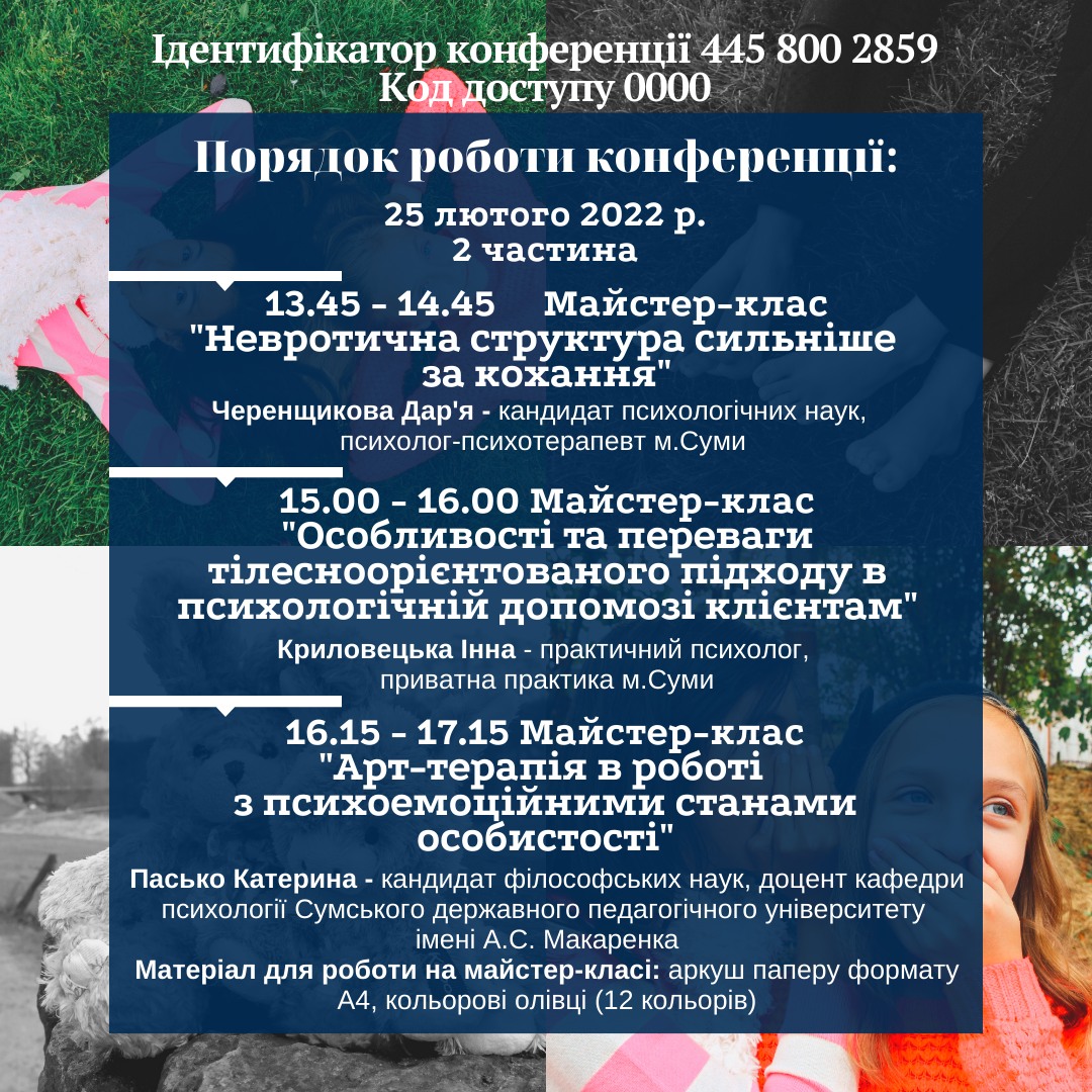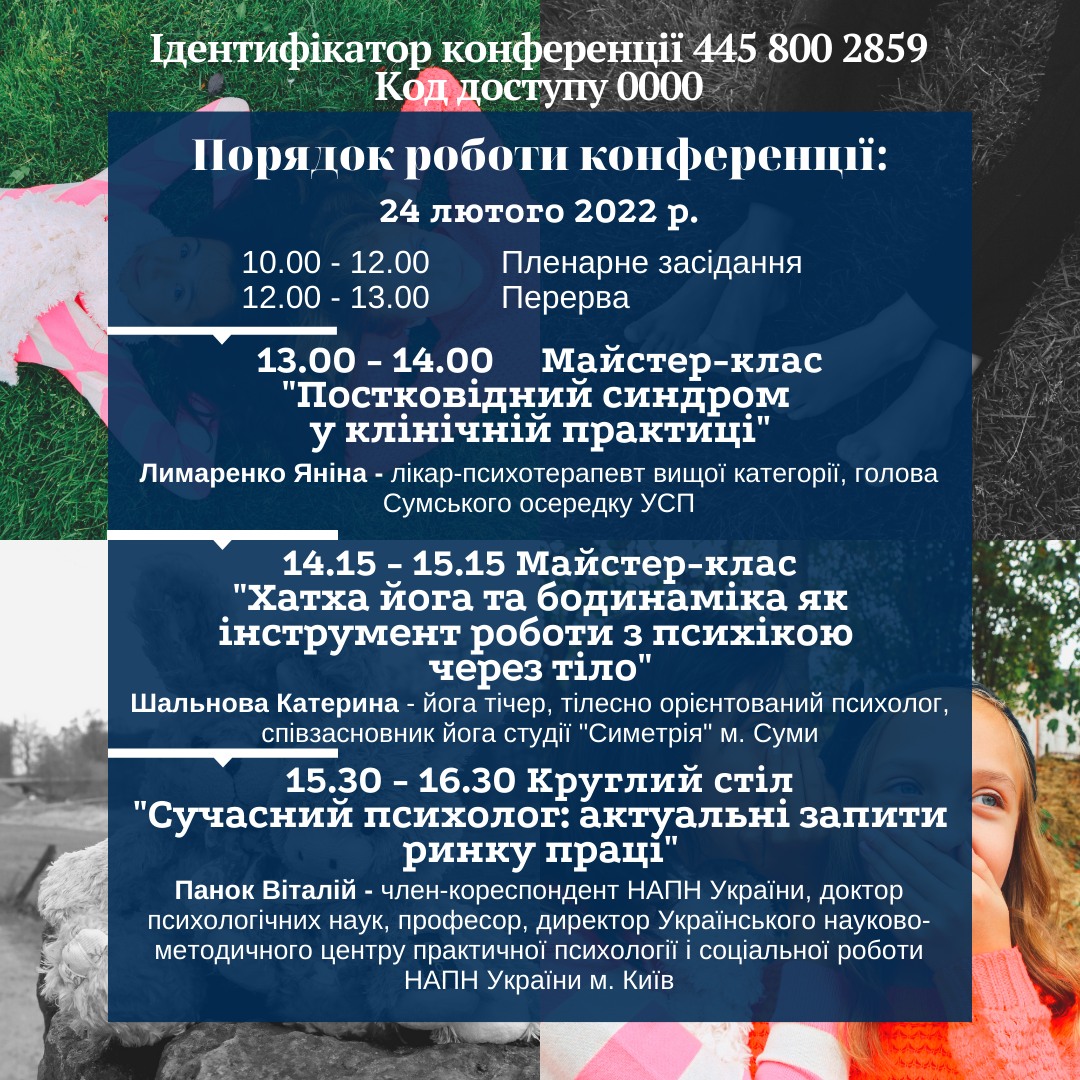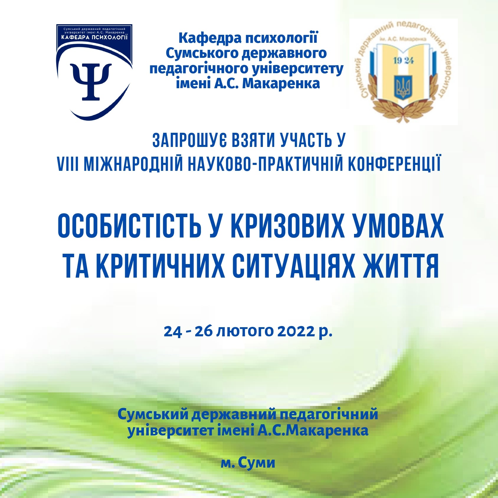Шановні колеги! Запрошуємо науковців, фахівців у галузі надання психологічної допомоги, всіх зацікавлених осіб до участі у VІІІ Міжнародній науково-практичній конференції «Особистість у кризових умовах та критичних ситуаціях життя», яка відбудеться 24-26 лютого 2022 р. на базі кафедри психології Сумського державного педагогічного університету імені А. С. Макаренка.
