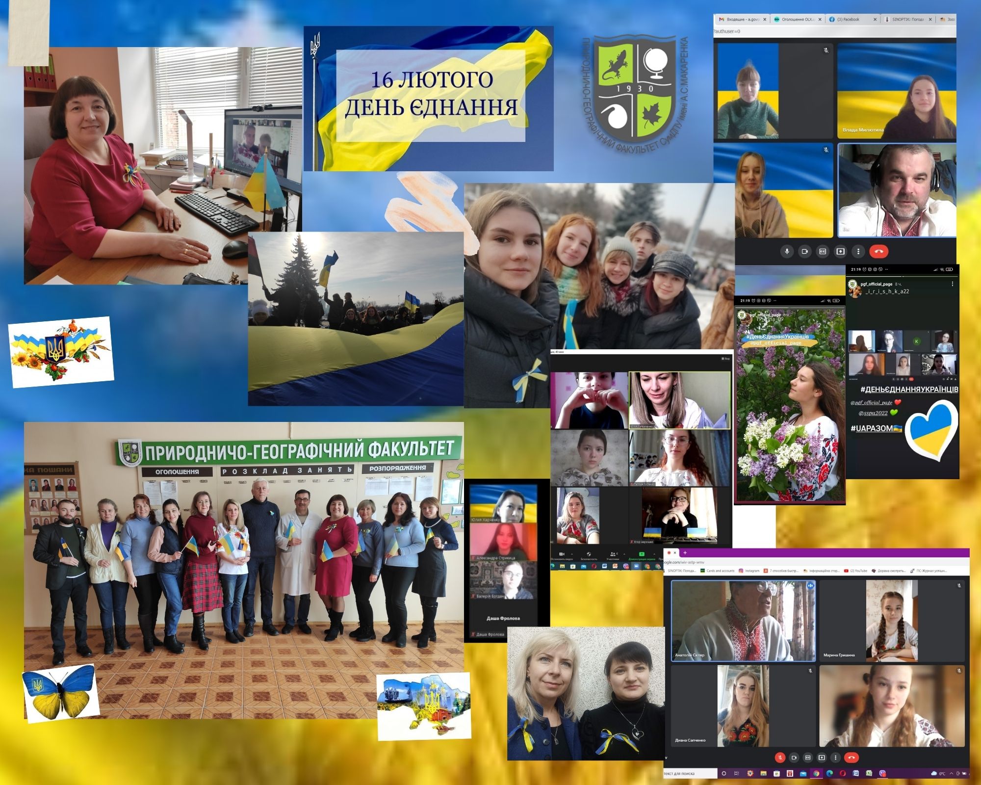 16 лютого 2022 року до Дня Єдності українців студенти, викладачі та співробітники природничо-географічного факультету підтримали всеукраїнську хвилю єднання. Викладачі Скляр А.М, Литвиненко Ю.І, Говорун О.В., Харченко Ю.В. провели заняття у вишиванках. Всі інші колеги разом зі студентами на он-лайн-заняттях доєднатися в одязі з українською символікою. На сторінці факультету в Instagram студенти публікували свої фото у вишиванках з #деньєднанняукраїнців, #uaразом.