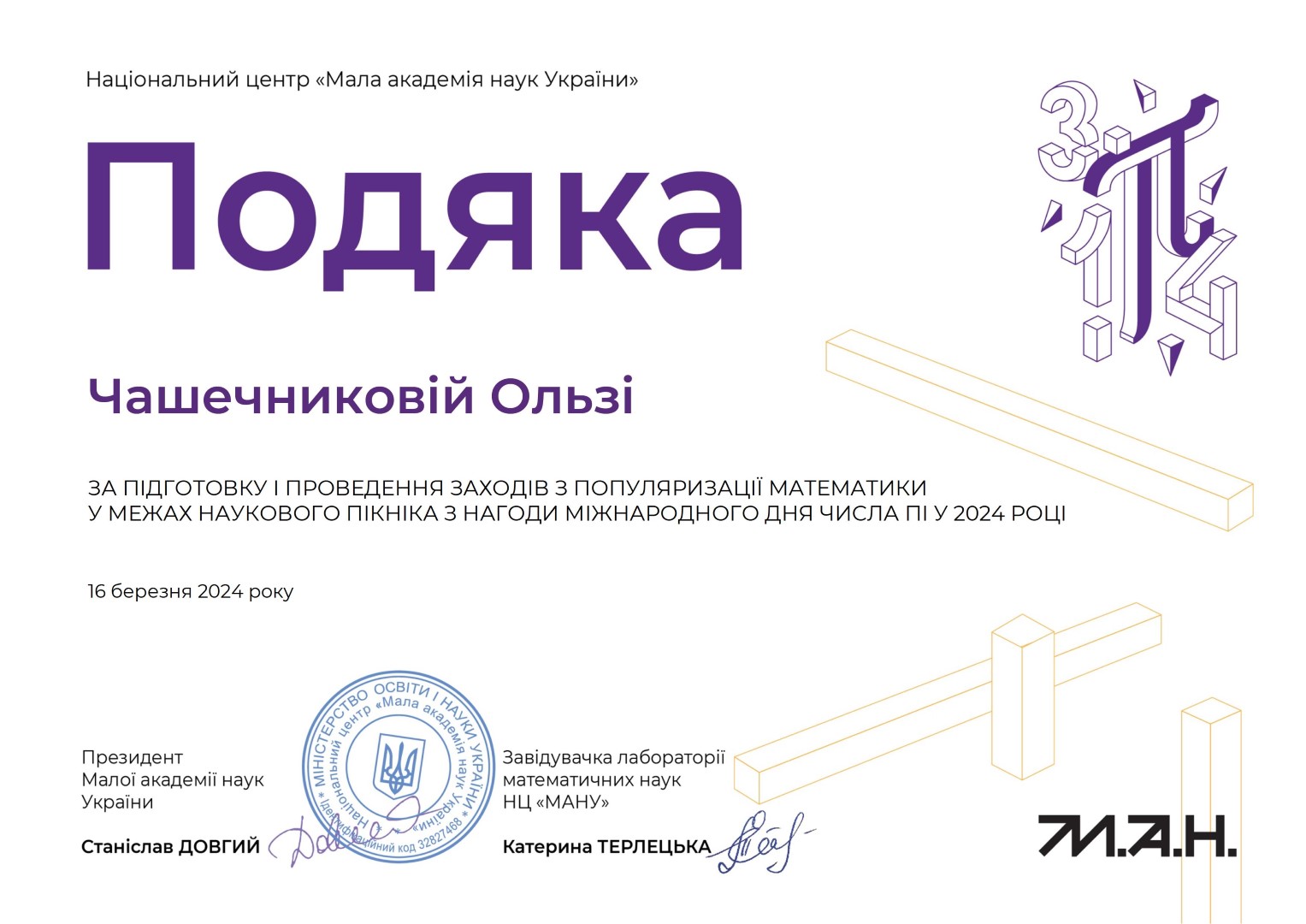 Національним центром «Мала академія наук України» високо оцінено роботу з популяризації математики у межах наукового пікніка з нагоди міжнародного дня числа пі у 2024 році на фізико-математичному факультеті СумДПУ імені А. С. Макаренка.