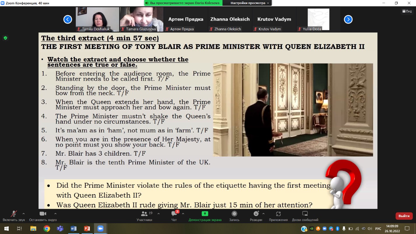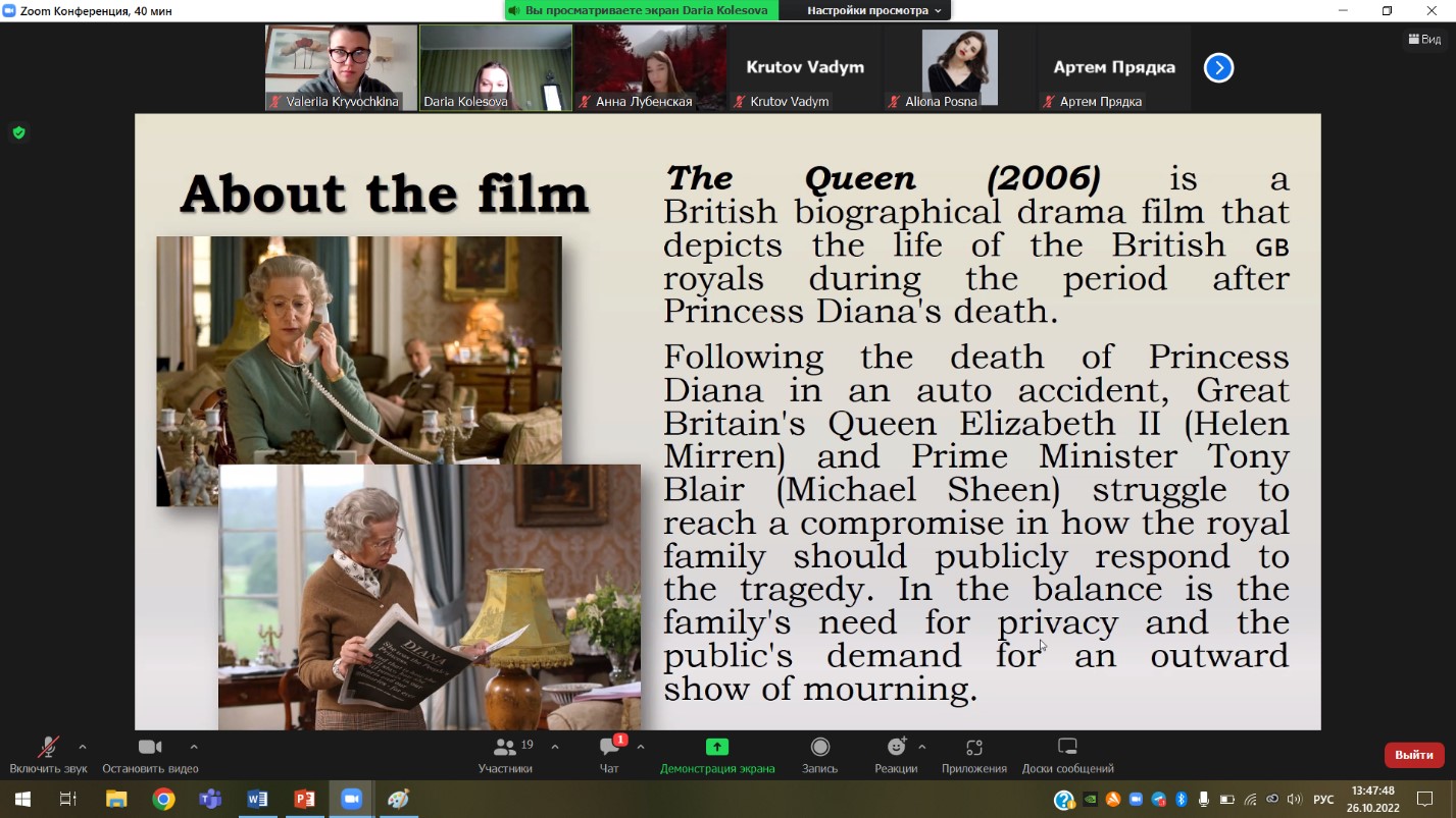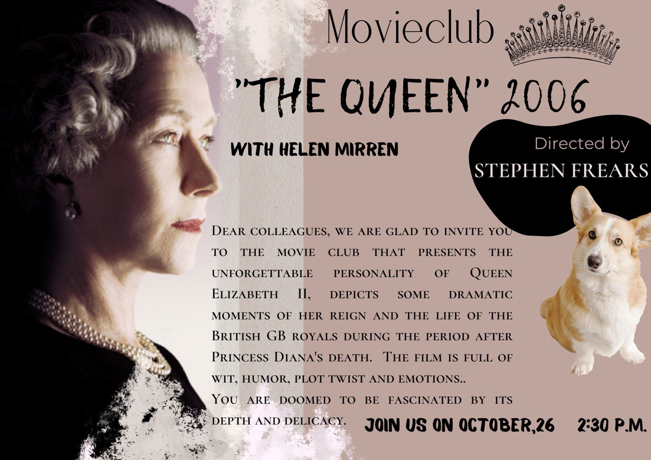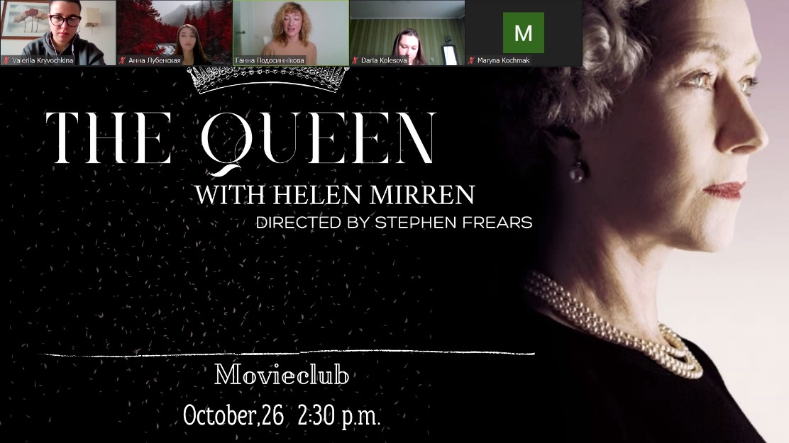 Цього разу кіноклуб відвідали студенти 3-го (підгрупи 331.1, 331.2, група 334) та 5-го (група 351) курсів з викладачем доцентом Подосинніковою Г.І. Зважаючи на останні події у Сполученому Королівстві Великої Британії, а саме смерть королеви Єлизавети II, віддаючи щиру данину поваги та пам’яті про неї, члени лабораторії студентки Лубенська Анна (група АМ-6), Кривочкіна Валерія (група 364) та Колесова Дарія (група 331.1) запропонували учасникам тренінгу переглянути та обговорити біографічний фільм «The Queen» (2006 року). Фільм присвячений королеві Єлизаветі ІІ, публічному та особистому життю британської королівської сім’ї з усіма її внутрішніми переживаннями та почуттями, можемо спостерігати також тонкощі та нюанси роботи прем’єр міністра, подробиці смерті принцеси Діани та багато іншого.