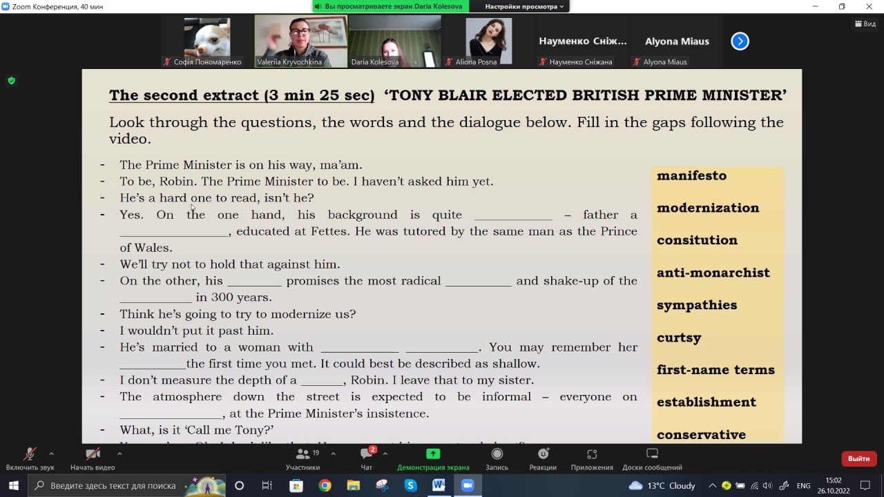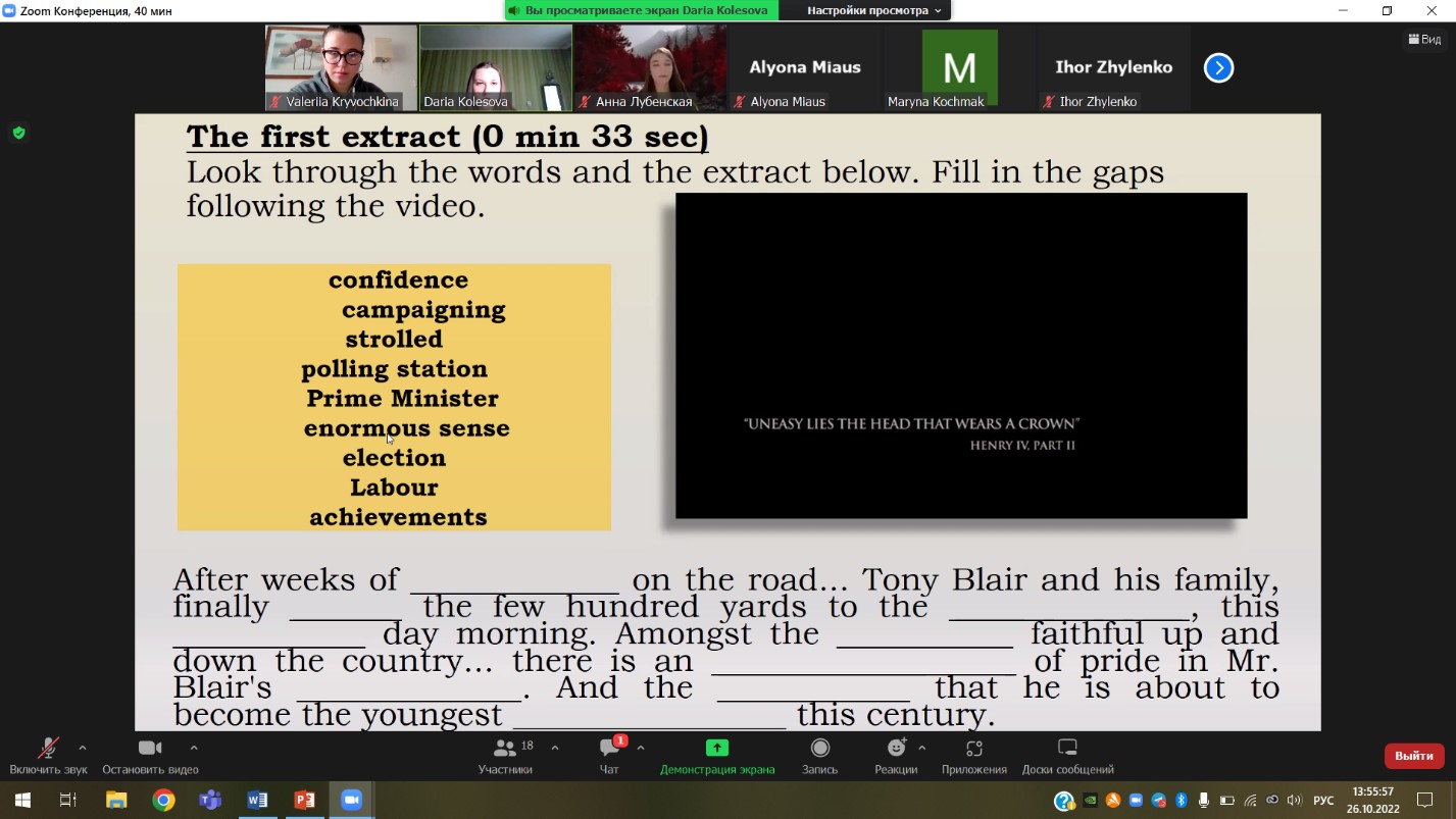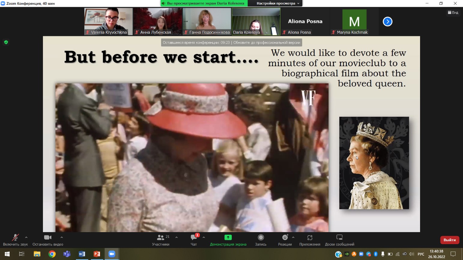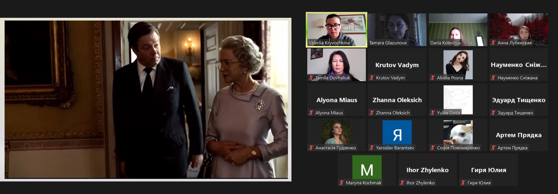 Цього разу кіноклуб відвідали студенти 3-го (підгрупи 331.1, 331.2, група 334) та 5-го (група 351) курсів з викладачем доцентом Подосинніковою Г.І. Зважаючи на останні події у Сполученому Королівстві Великої Британії, а саме смерть королеви Єлизавети II, віддаючи щиру данину поваги та пам’яті про неї, члени лабораторії студентки Лубенська Анна (група АМ-6), Кривочкіна Валерія (група 364) та Колесова Дарія (група 331.1) запропонували учасникам тренінгу переглянути та обговорити біографічний фільм «The Queen» (2006 року). Фільм присвячений королеві Єлизаветі ІІ, публічному та особистому життю британської королівської сім’ї з усіма її внутрішніми переживаннями та почуттями, можемо спостерігати також тонкощі та нюанси роботи прем’єр міністра, подробиці смерті принцеси Діани та багато іншого.