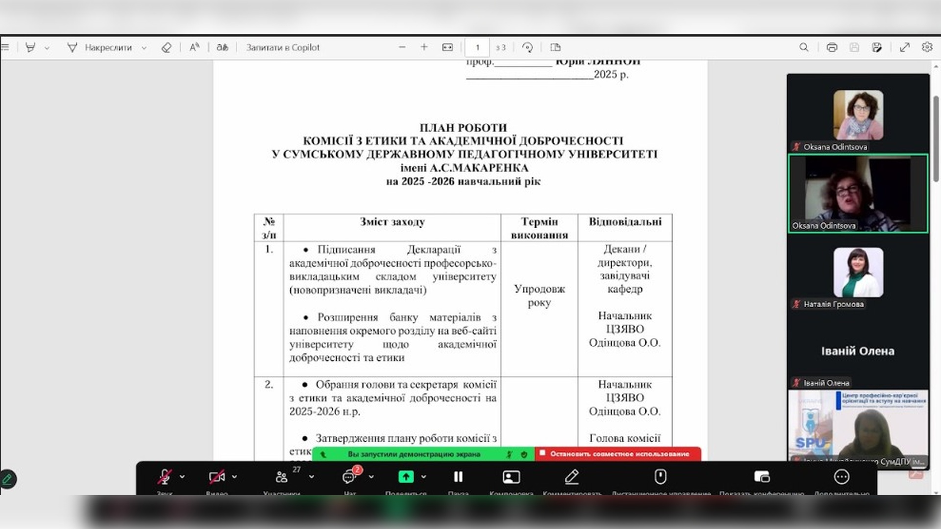 - Про оновлення складу Комісії з етики та академічної доброчесності та Комісії із забезпечення якості освітньої діяльності та якості вищої освіти Сумського державного педагогічного університету імені А. С. Макаренка (доп. начальник Центру забезпечення якості вищої освіти Одінцова Оксана Олександрівна).