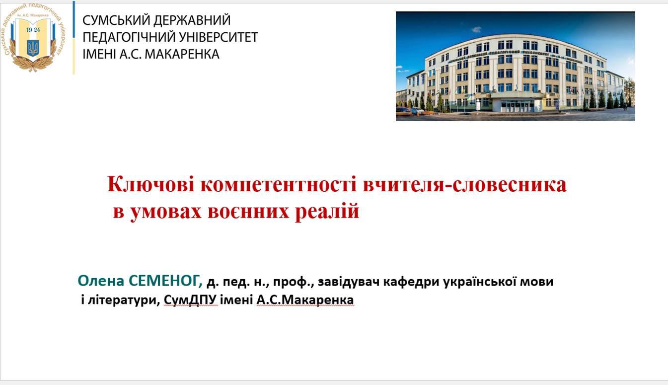 Модерувала захід і виступила з основною доповіддю Ольга Смоленко , методист Навчально-методичного центру професійно-технічної освіти у Сумській області. На заході кафедра української мови і літератури представила такі доповіді: «Ключові компетентності вчителя-словесника в умовах воєнних реалій» (Олена СЕМЕНОГ, доктор педагогічних наук, професор); «Формування читацької грамотності старшокласників на уроках зарубіжної літератури (на засадах дослідження PISA-2018)». (Юлія Плужник, вчитель зарубіжної літератури Роменської загальноосвітньої школи І-ІІІ ступенів №5 Роменської міської ради Сумської області, магістрантка Сумського державного педагогічного університету імені А. С. Макаренка)