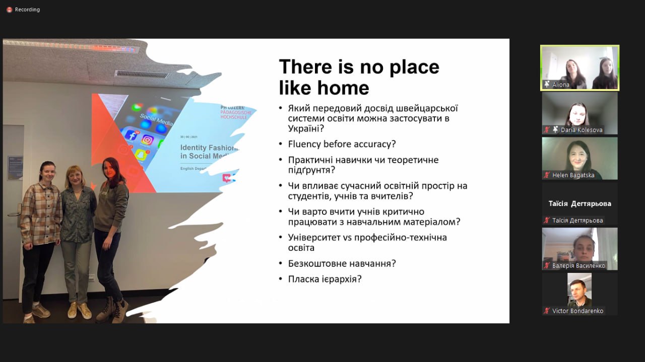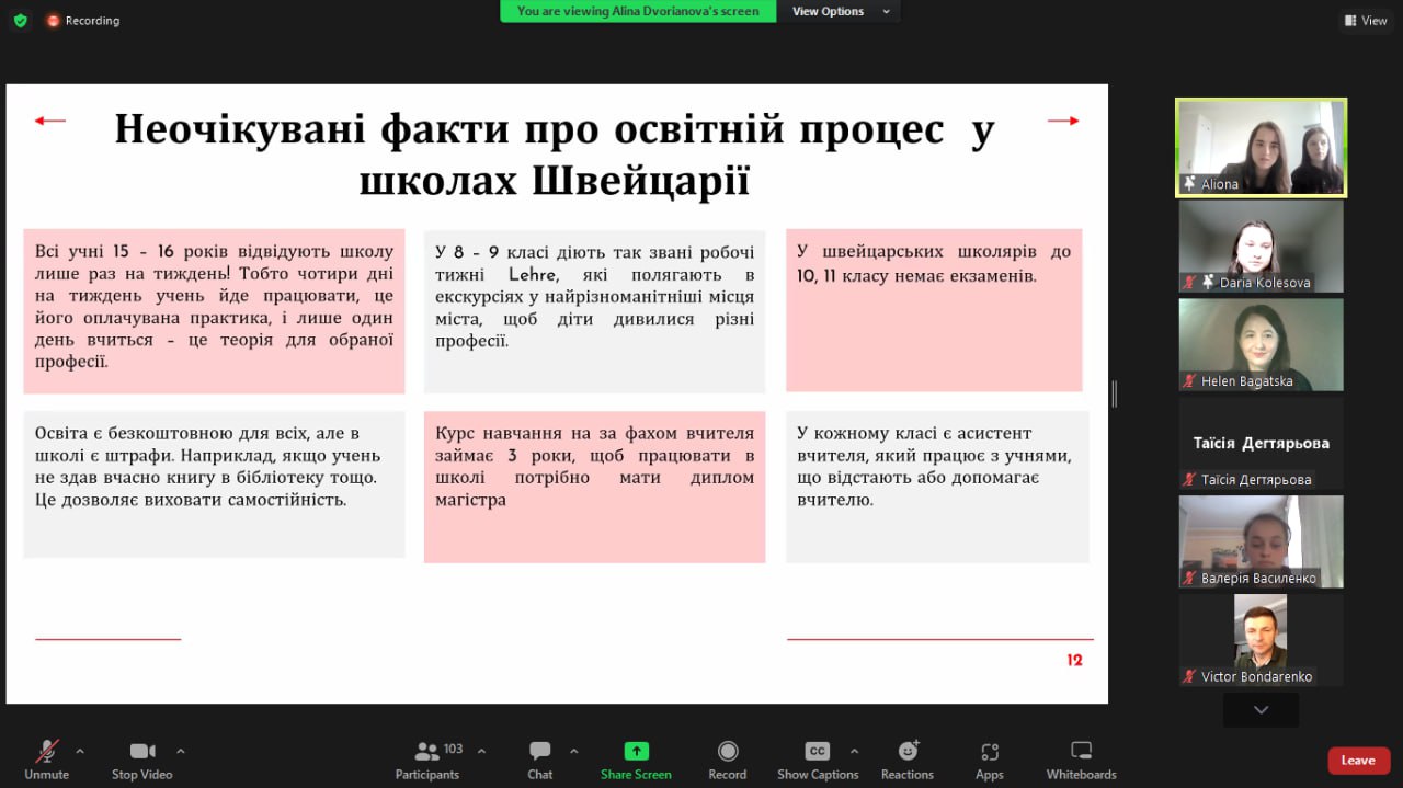 У запропонованій презентації студентки глибоко та масштабно представили особливості академічного процесу у швейцарському університеті, поділилися цінним досвідом проходження педагогічної практики, а також розповіли про студентське дозвілля.