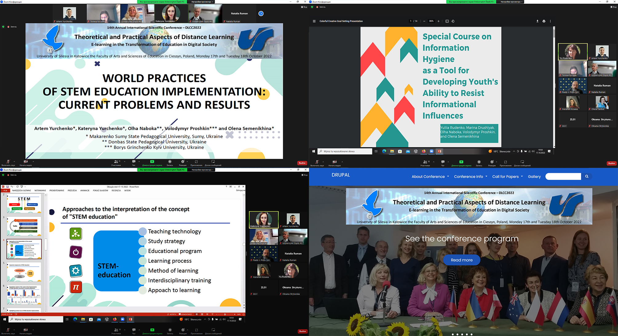 На науковому заході в онлайн-режимі представили результати власних наукових пошуків аспірантка другого року навчання спеціальності 015 Професійна освіта (цифрові технології) Катерина Юрченко з доповіддю "World practices of STEM education implementation: current problems and results" та доцент кафедри інформатики Юлія Руденко, яка торкнулася питань інформаційної гігієни молоді та її формування (тема доповіді "Special Course on Information Hygiene as a Tool for Developing Youth's Ability to Resist Informational Influences"). За онлайн-трансляцією виступів слідкували інші аспіранти кафедри інформатики.