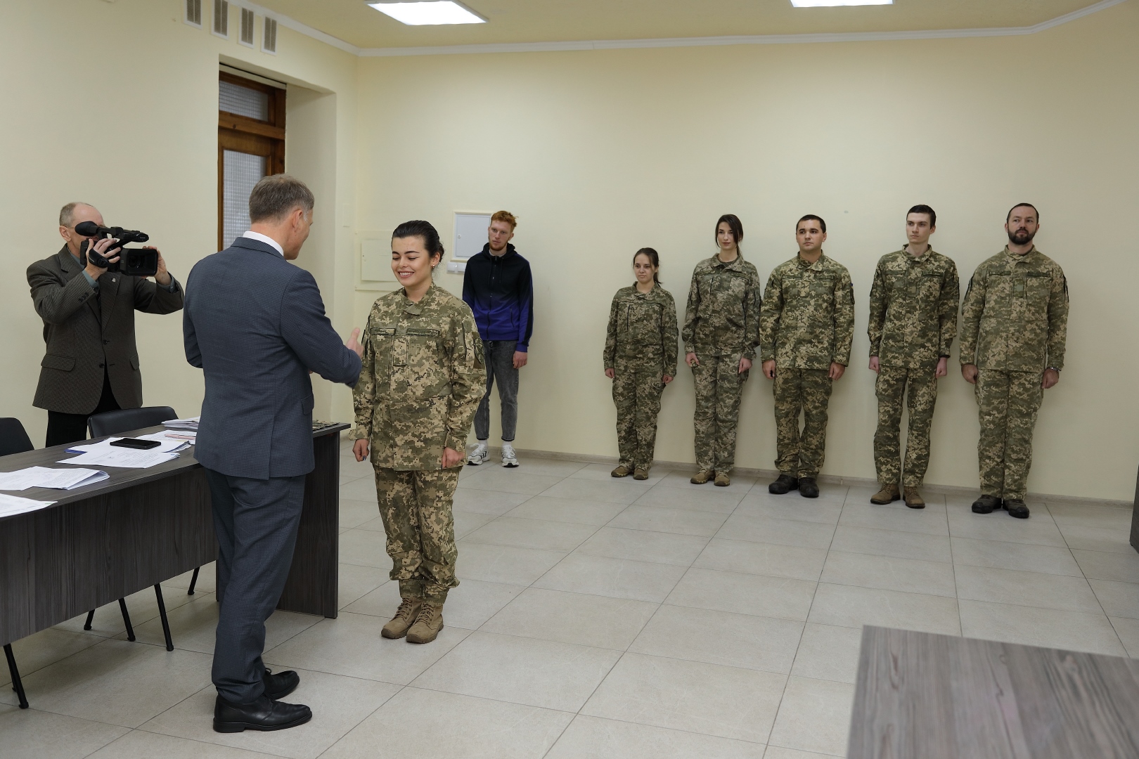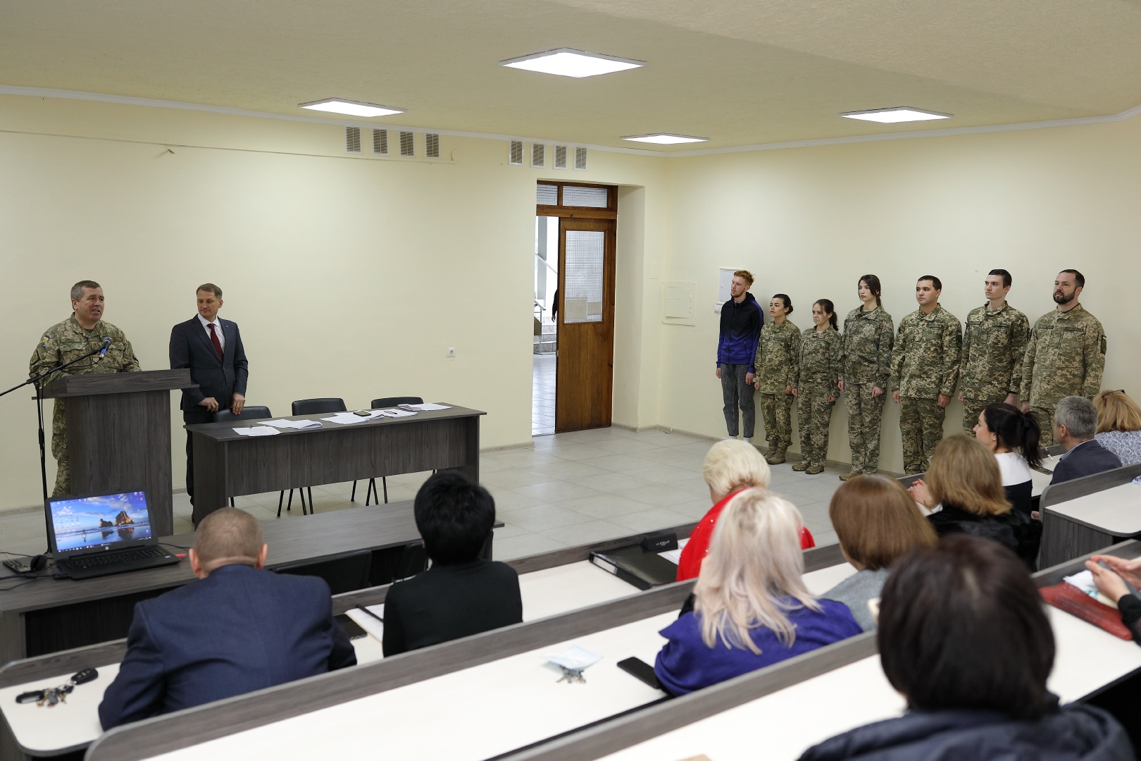 Далі засідання перемістилося до 202 аудиторії, де відбулося вручення погонів молодшого лейтенанта випускникам військової кафедри.