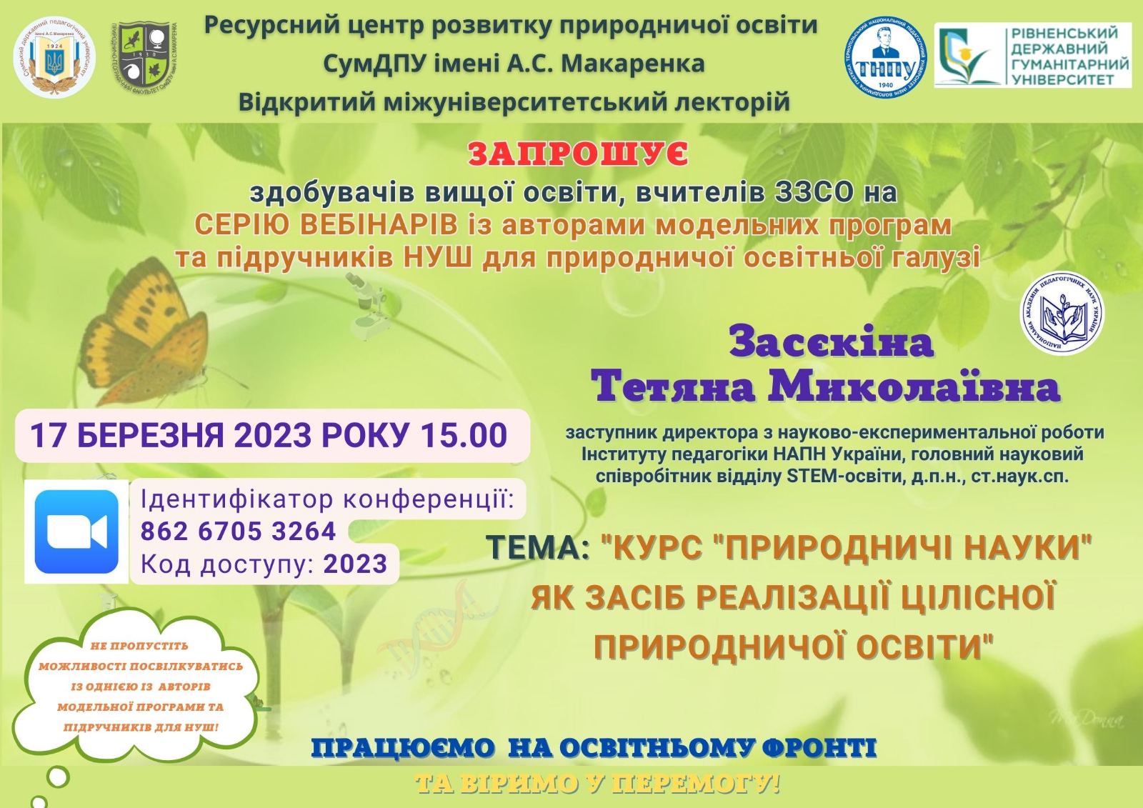 Вебінар організований та проведений у рамках роботи Відкритого міжуніверситетського лекторію «Професійно-методична підготовка педагога з проблем природничої освіти» - https://pgf.sspu.edu.ua та Ресурсного центру розвитку природничої освіти СумДПУ імені А.С. Макаренка, що функціонує на природничо-географічному факультеті СумДПУ імені А.С. Макаренка - https://pgf.sspu.edu.ua