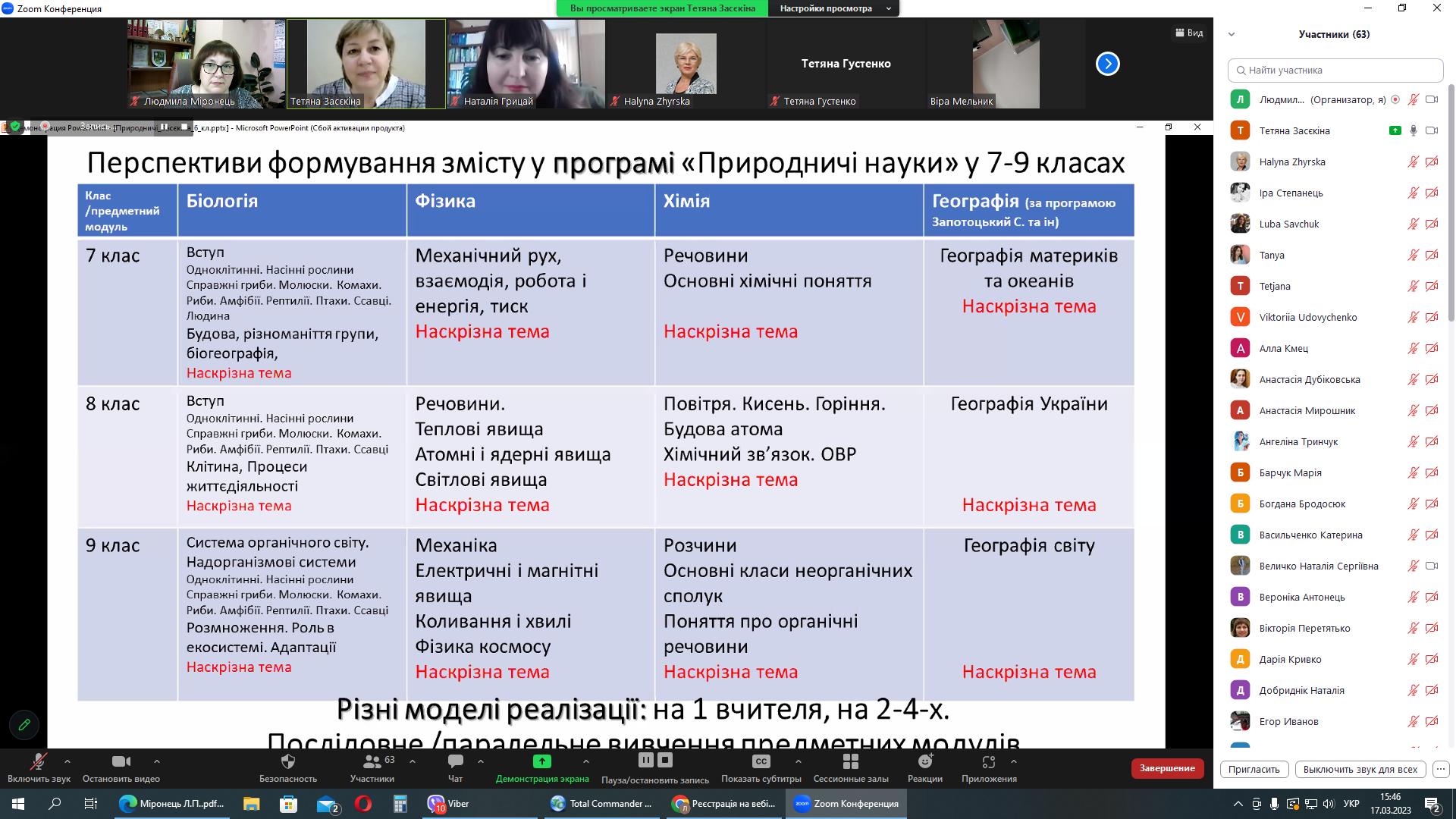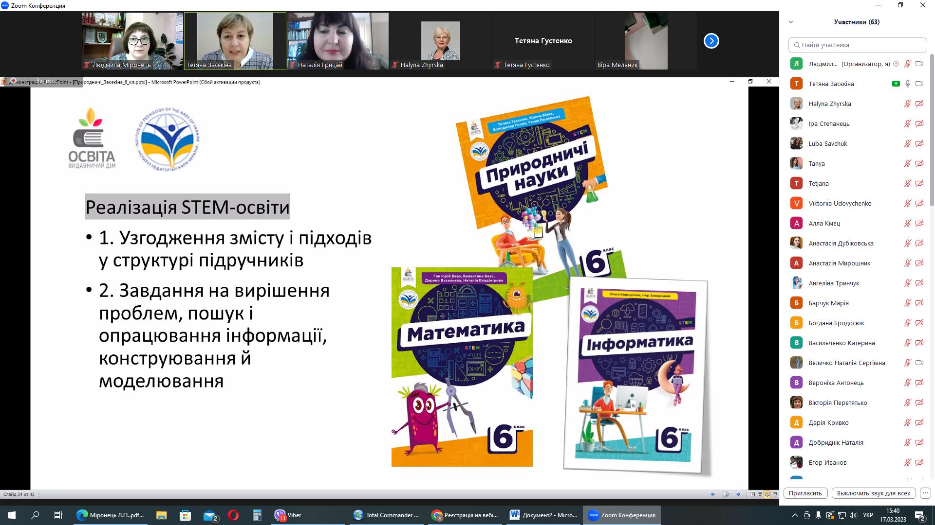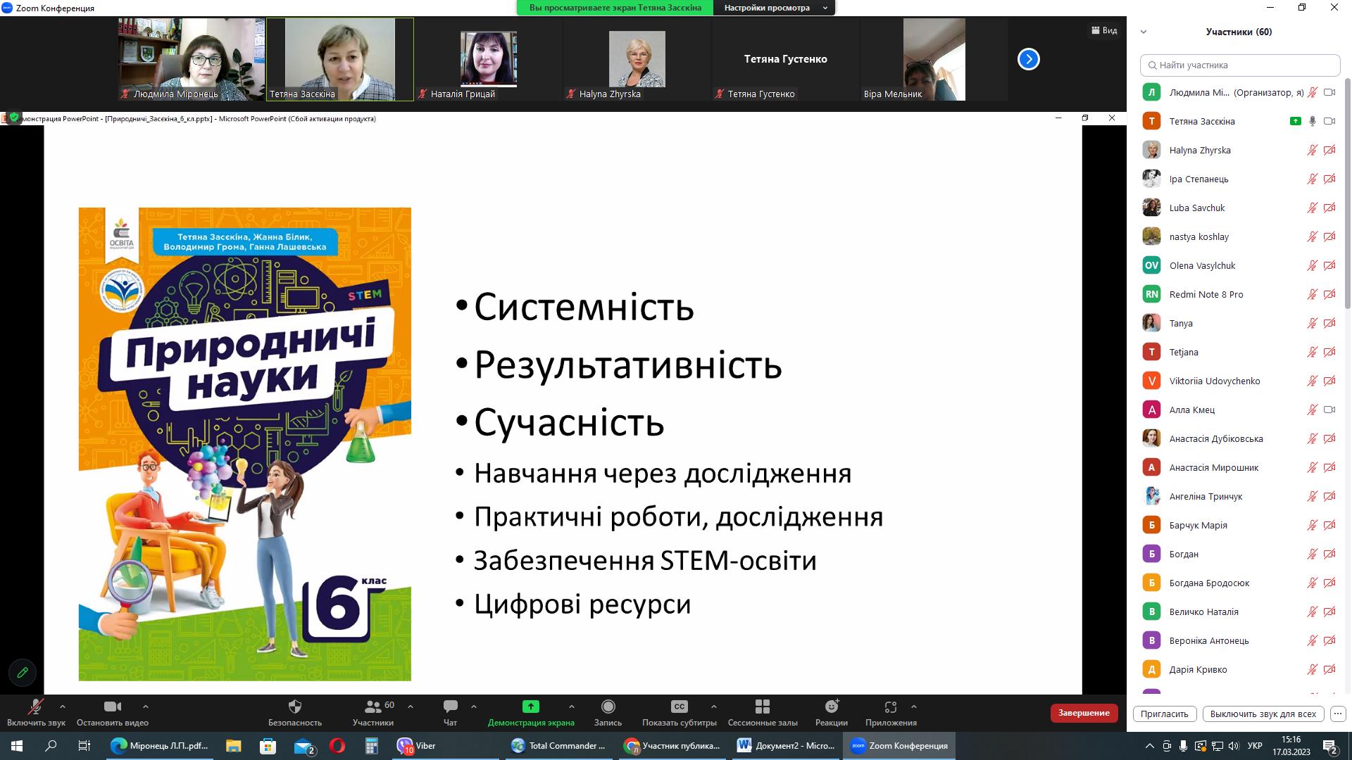 17 березня 2023 року серію вебінарів із авторами модельних програм та підручників для НУШ природничої освітньої галузі продовжила зустріч із Тетяною Миколаївною Засєкіною, заступником директора з науково-експериментальної роботи Інституту педагогіки НАПН України, головним науковим співробітником відділу STEM-освіти, д.п.н., старшим науковим співробітником.