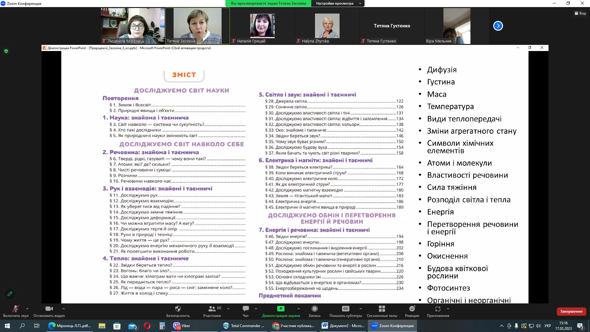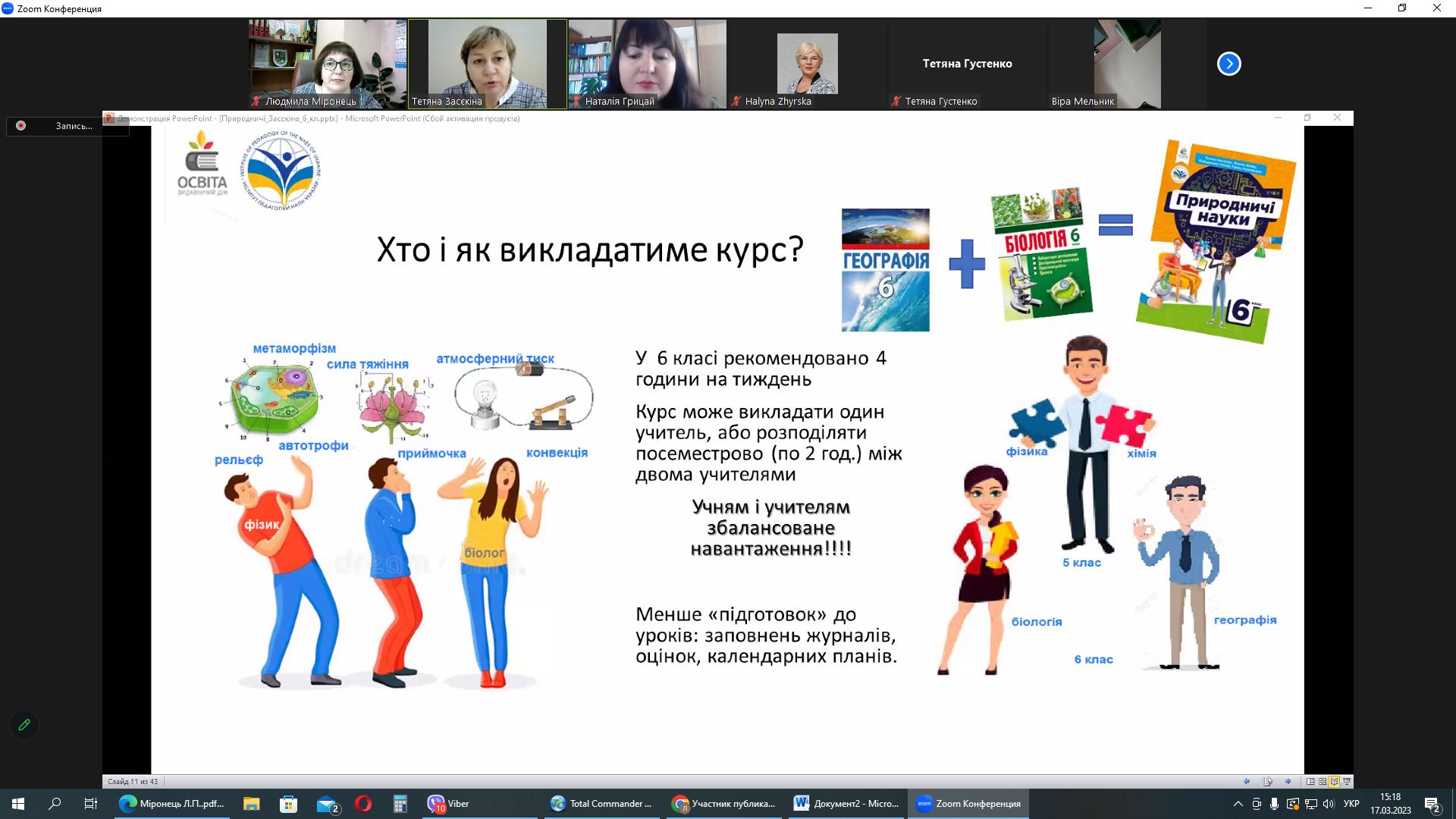 Спікерка познайомила учасників вебінару із структурою та змістом підручника «Природничі науки» для 6 класу НУШ, за яким уперше в Україні буде реалізовуватися цілісна неперервна природнича освіта. Тетяна Миколаївна схарактеризувала основні методичні підходи, які закладені у цьому підручнику, обов’язкові результати навчання та перспективи формування змісту програми «Природничі науки» для 7-9 класів. Останнє питання викликало жваве обговорення серед присутніх та необхідність організації круглого столу по обговоренню змісту програми для 7-9 класів.
