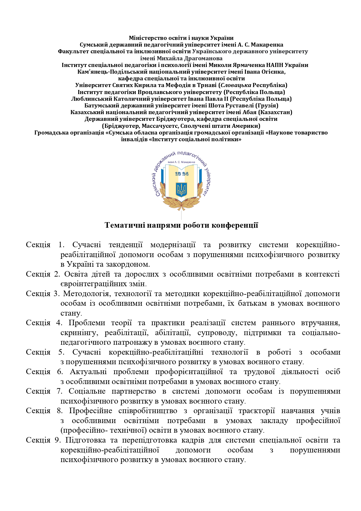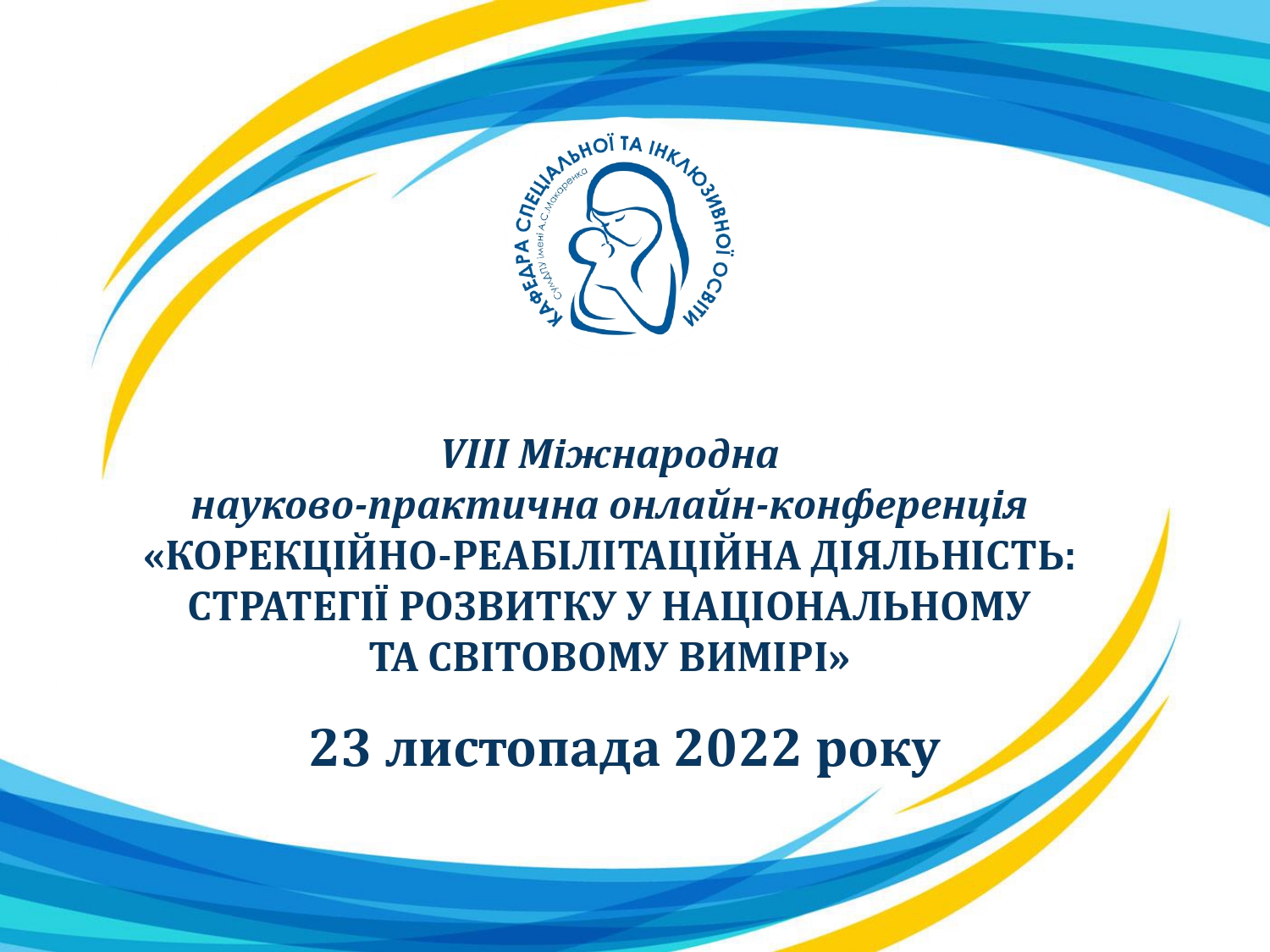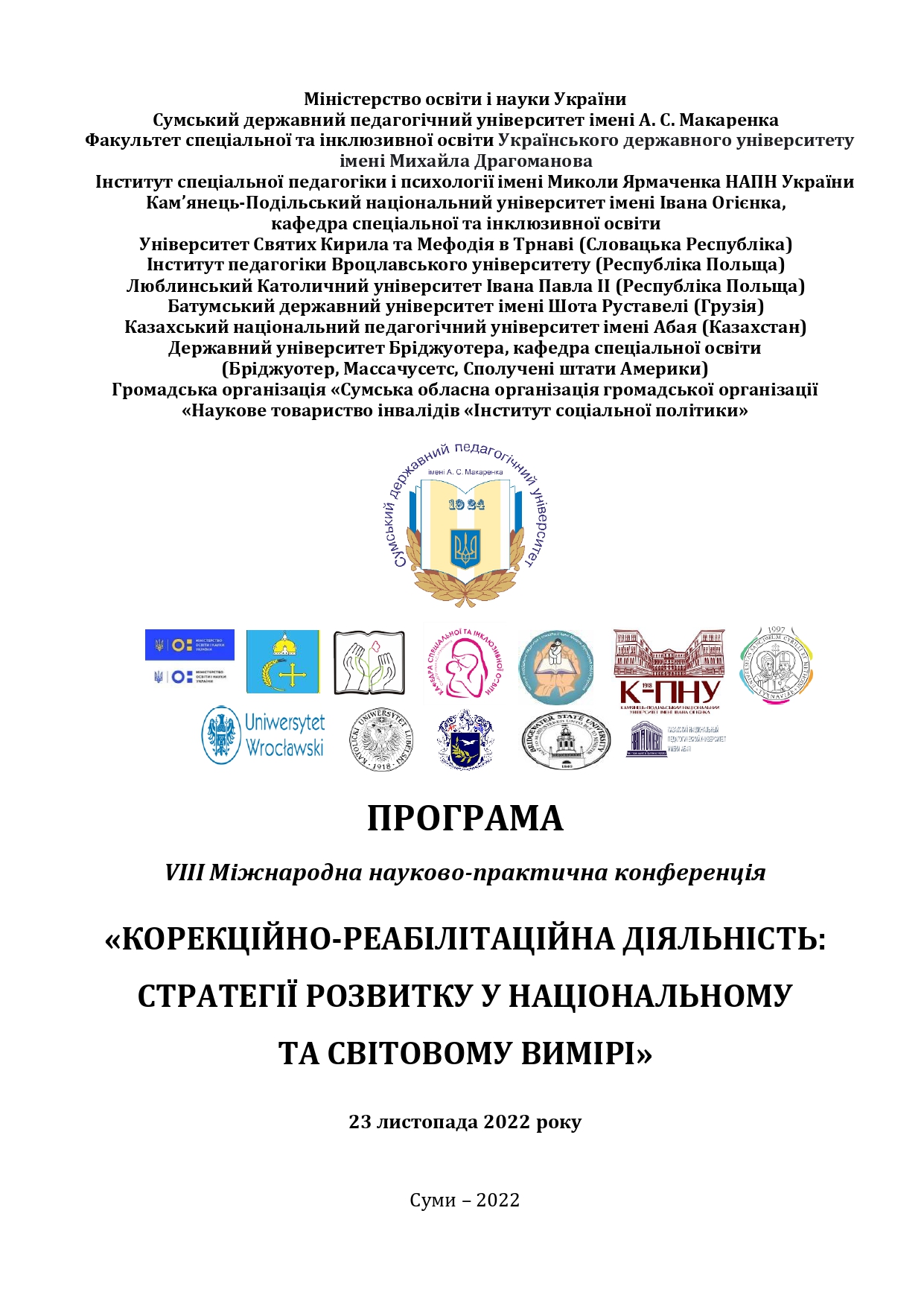 23 листопада 2022 р. кафедрою спеціальної та інклюзивної освіти Навчально-наукового інституту педагогіки і психології СумДПУ імені А. С. Макаренка проведено VІІІ Міжнародну науково-практичну конференцію зі спеціальної педагогіки, психології та реабілітації на тему «Корекційно-реабілітаційна діяльність: стратегії розвитку у національному та світовому вимірі».