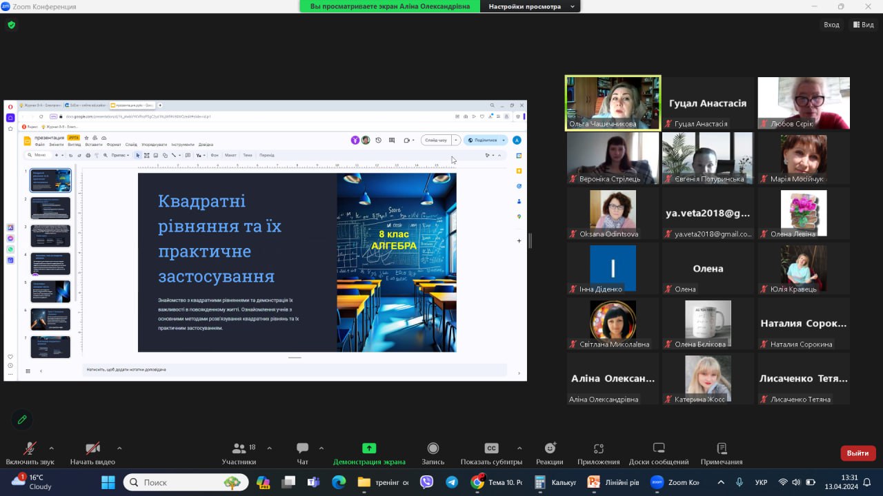 Викладачі кафедри математики, фізики та методик їх навчання тренери - Чашечникова Ольга Серафимівна та Одінцова Оксана Олександрівна проводять тренінги і для трьох груп вчителів з інших областей: Луганської (06 квітня та 13 квітня), Херсонської (20 квітня, 27 квітня та 11 травня), Донецької (18 травня, 25 травня та 01 червня). Всього у цих тренінгах взяло участь близько 90 вчителів. Незважаючі на умови, в яких працюють вчителі цих областей зараз, вони непохитні! Тримаймо стрій!