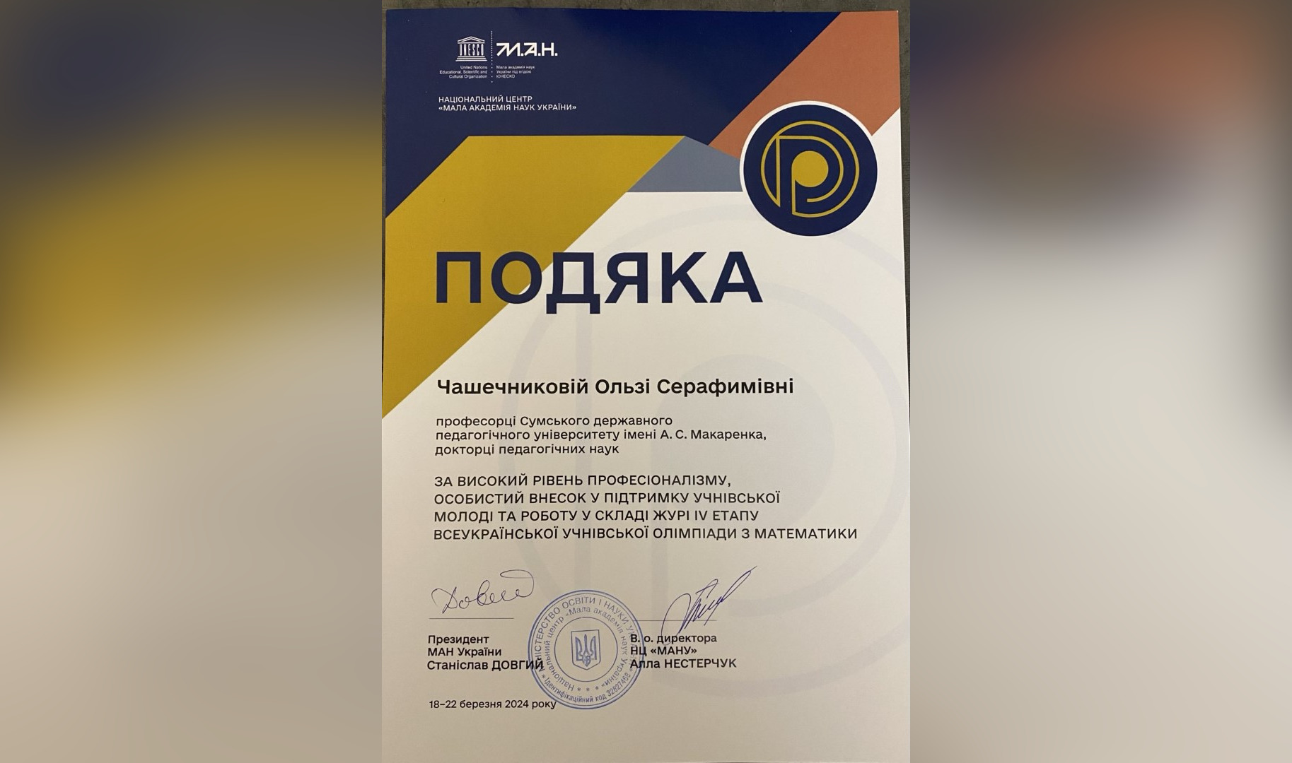 З 18 по 22 березня 2024 року у м. Ужгород відбувся IV етап Всеукраїнської олімпіади з математики. Серед членів журі – завідувач кафедри математики, фізики та методик їх навчання, професор Сумського державного педагогічного університету імені А. С. Макаренка, доктор педагогічних наук Ольга ЧАШЕЧНИКОВА.