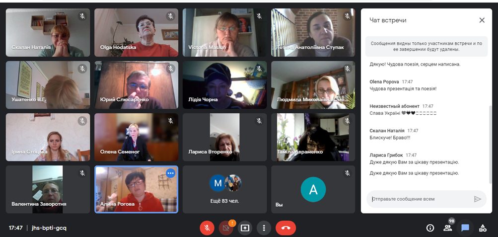 Спільно зі стейкхолдерами провели заняття. Зокрема питання навчання української літератури в умовах воєнного часу та патріотичного виховання розглядали спільно з Бабійчук Тамарою Василівною, канд. пед. наук, викладачем-методистом вищої категорії Бердичівського педагогічного фахового коледжу, Білясником Михайлом Дмитровичем, учителем української мови і літератури Шосткинської гімназії Шосткинської міської ради, учителем-методистом, головою методичного об'єднання вчителів української мови і літератури Шосткинської об'єднаної територіальної громади. фрагмент заняття. https://www.youtube.com/watch?v=Ih50dcE22CY