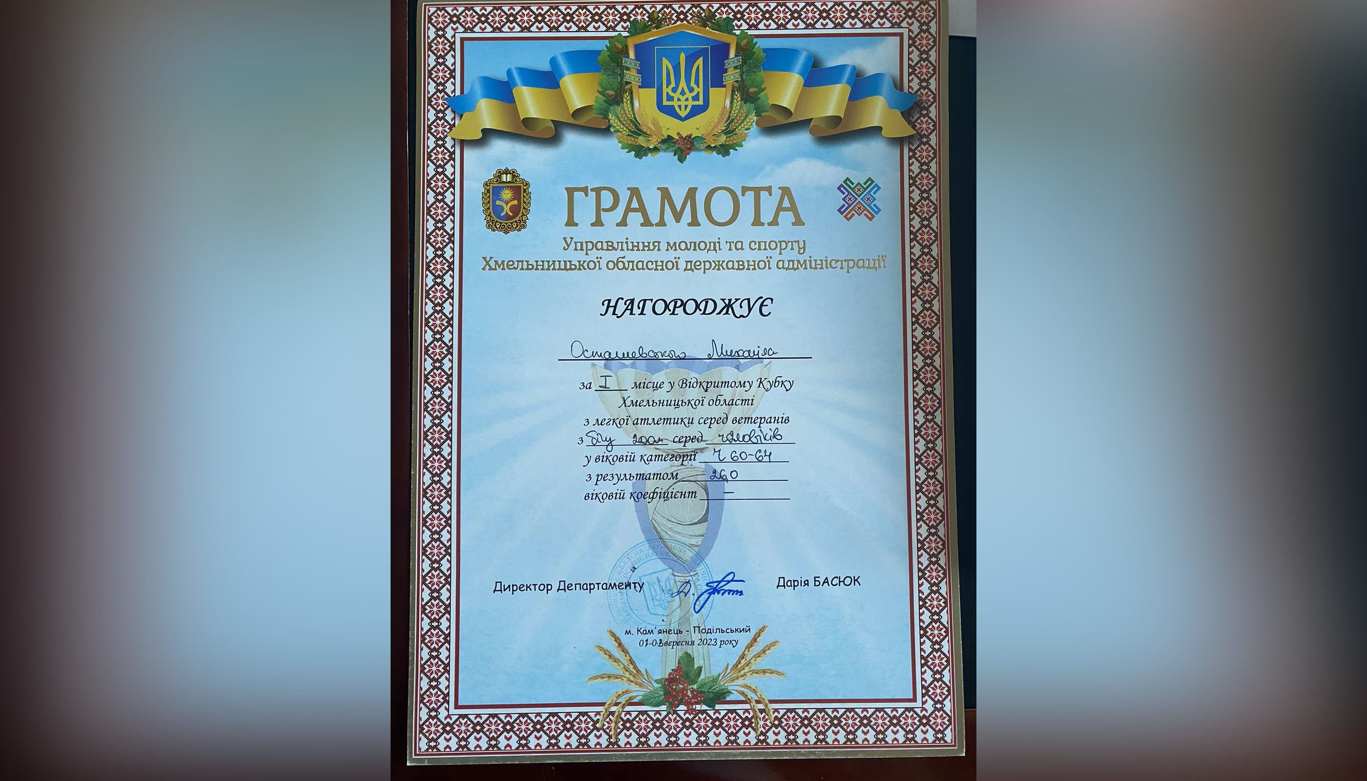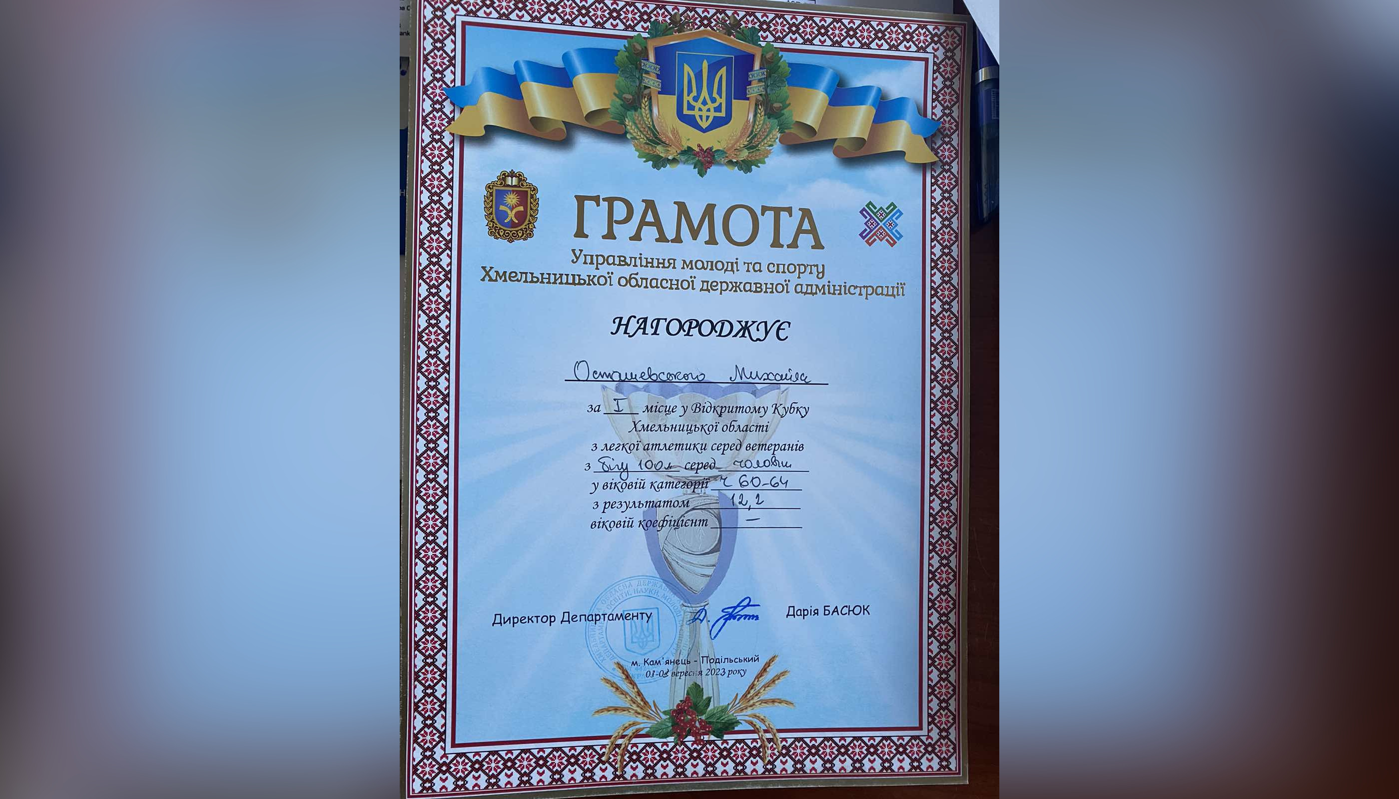 СумДПУ імені А.С. Макаренка вітає провідного фахівця дирекції Навчально-наукового інституту фізичної культури, Заслуженого журналіста України Михайла Леонідовича Осташевського з перемогою у Відкритому Кубку Хмельницької області з легкої атлетики серед ветеранів (біг на 100 м. та 200 м.)!