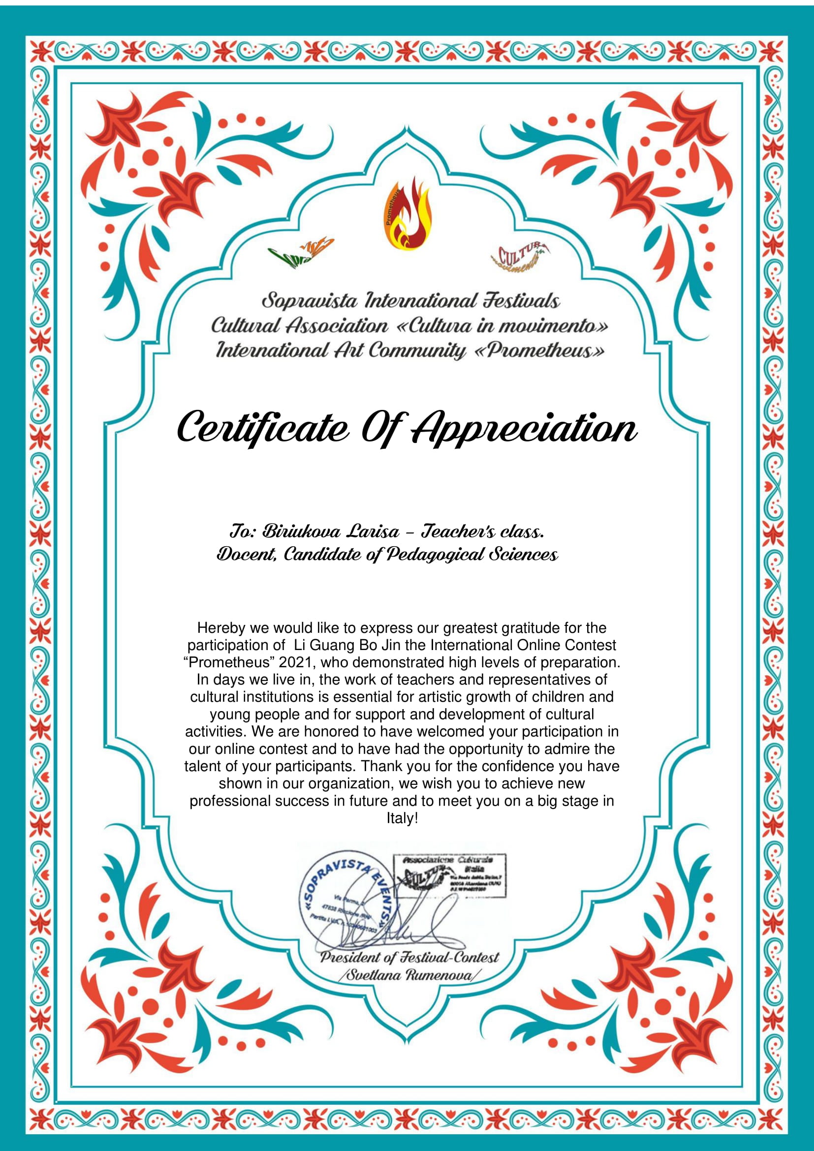 Вітаємо студентів: Лі Гуан Бо Цзинь (бас) - 1 місце, клас кандидата педагогічних наук, доцента Бірюкової Л. А.; Ло Ченг Ю (барітон)- 1 місце, клас викладача Бірюкової Л. А.; Шен Шую Є (сопрано) - 1 місце, клас викладача Бірюкової Л. А.