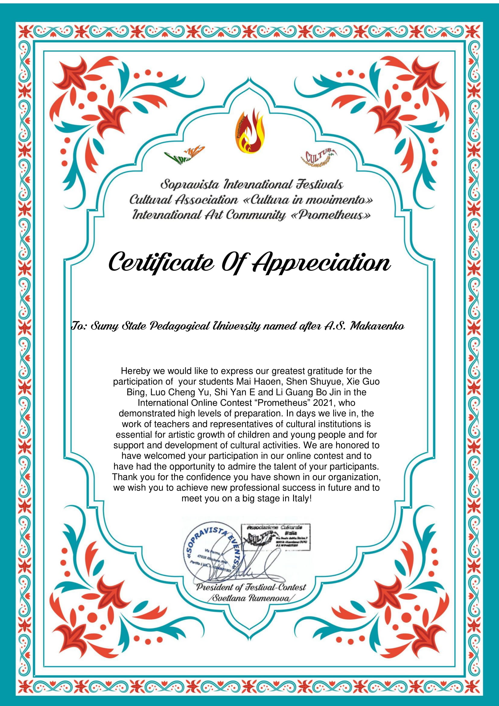Також, на університет надійшов лист Подяки від президента конкурсу Прометей (Італія) за професійну підготовку наших студентів