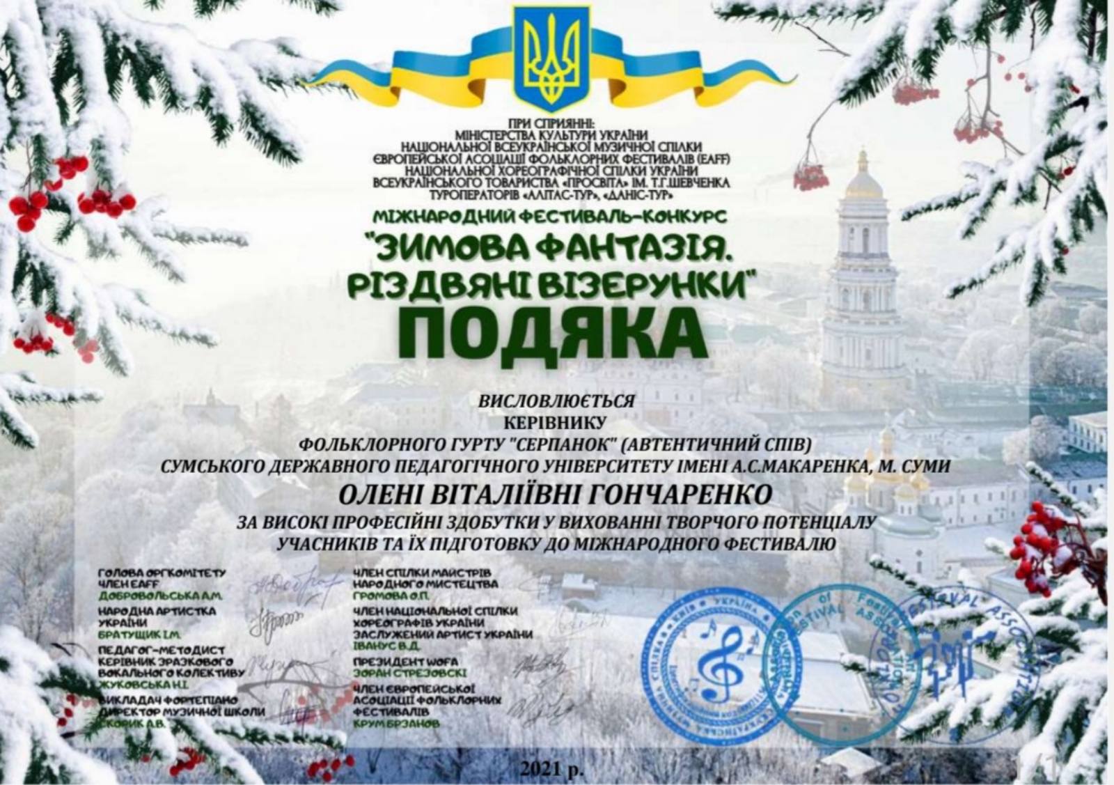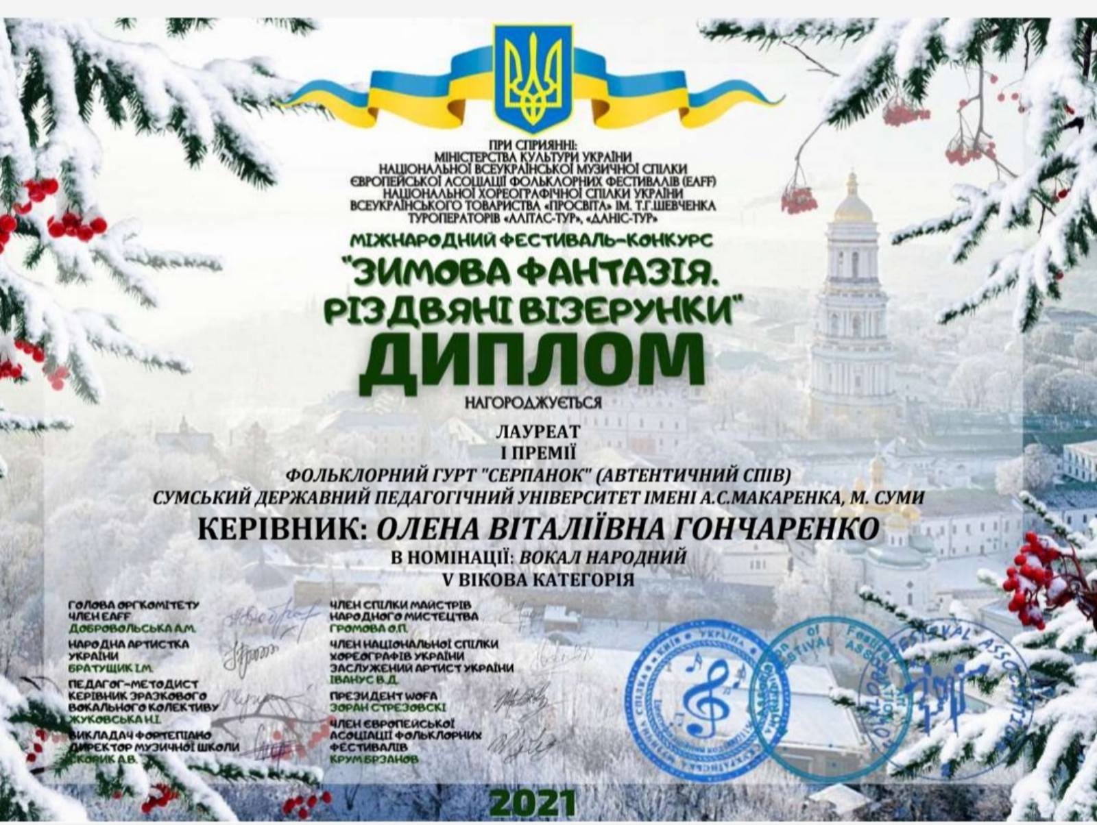 Вітаємо фольклорний гурт Навчально-наукового інституту культури і мистецтв «Серпанок» та керівника Гончаренко О. В., що стали лауреатами І премії міжнародного фестивалю-конкурсу «Зимова фантазія. Різдвяні візерунки» у номінації народний вокал.
