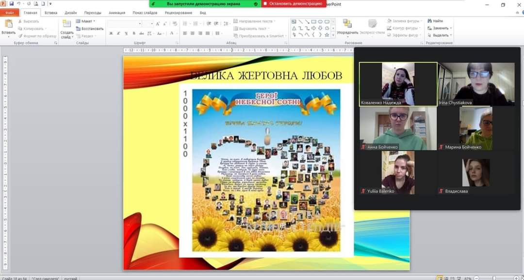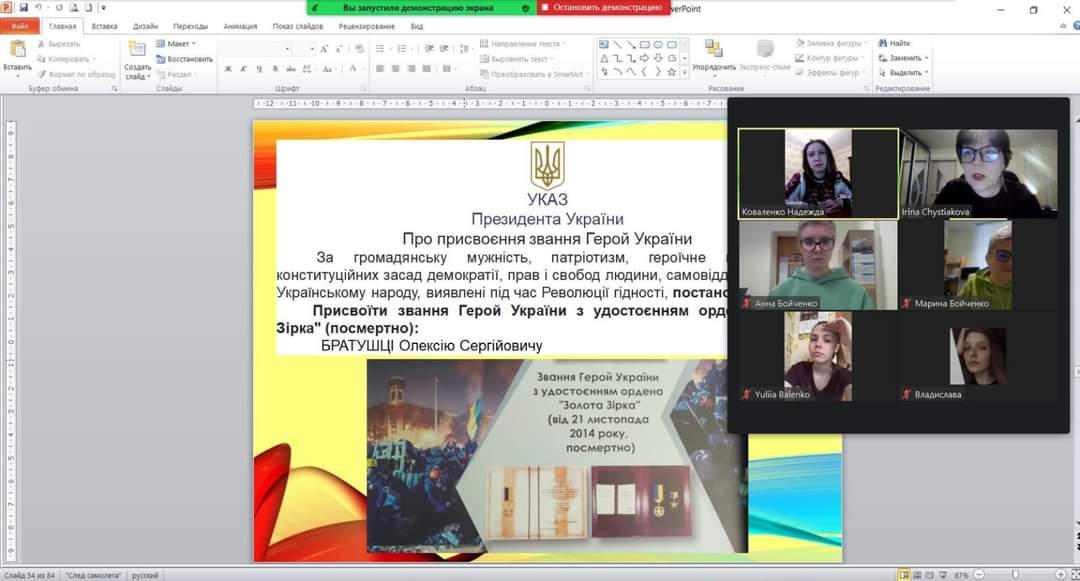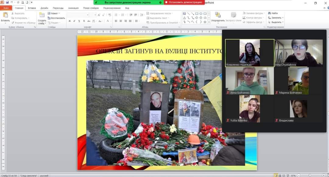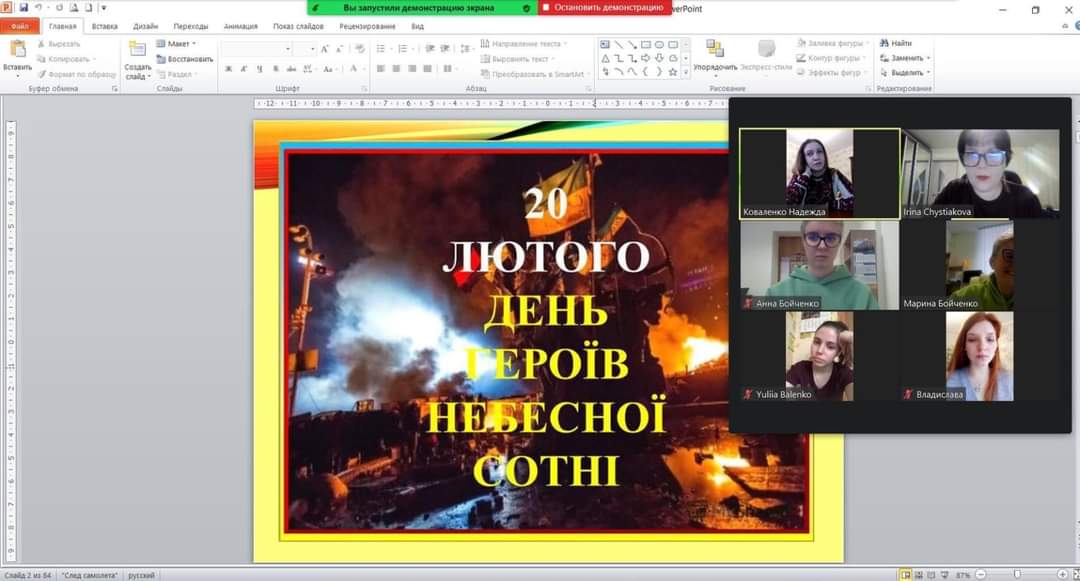 Студенти 0035 і 0036 груп разом з куратором, к.п.н., доц. Гончаренко Оленою Володимирівною на кураторській годині також згадали про тих, хто вісім років тому, відстоюючи демократичні цінності і територіальну цілісність України, віддали найцінніше – свої життя. Студентам було запропоновано перегляд документального фільму "Люди створюють історію. Небесна сотня", який нагадав їм про найтрагічніші моменти масових розстрілів протестувальників під час Революції Гідності 2013–2014 років.