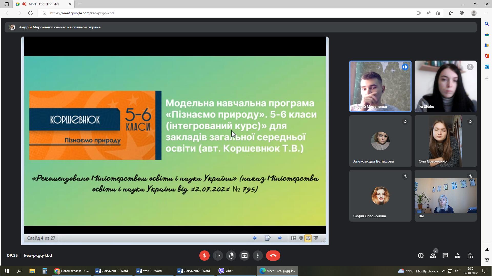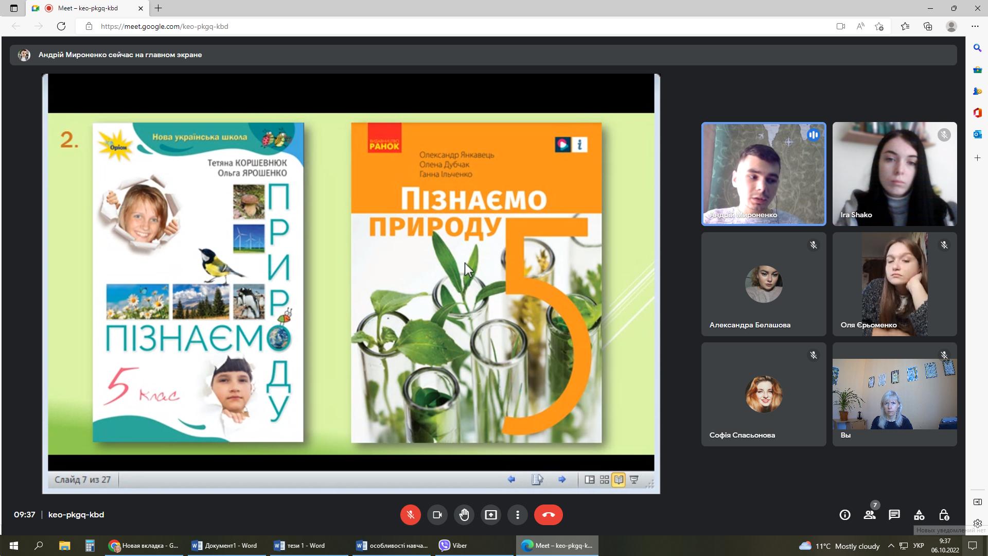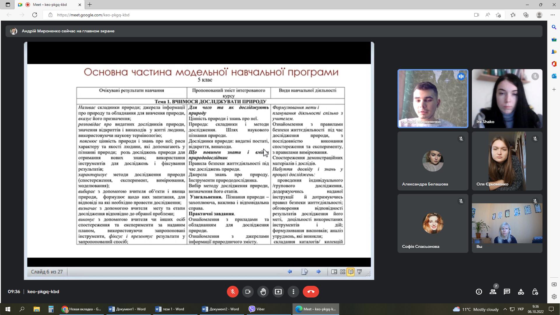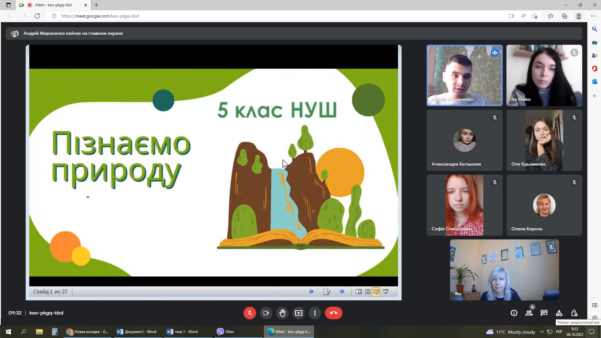 Темою онлайн заняття було обговорення особливостей навчання курсу «Пізнаємо природу» у 5 класі в рамках Нової української школи (НУШ). Участь у занятті взяли студенти 741 групи та магістранти 751 групи спеціальності 014 Середня освіта (Географія). У ході лекції було розглянуто структуру модельної програми курсу, проаналізовано очікувані результати, зміст інтегрованого курсу, види навчальної діяльності. Окремим питанням було обговорення матеріалу шкільного підручника, сучасних методів навчання в НУШ, проведенню експериментів в курсі «Пізнаємо природу», особливостям створення проєктів з учнями 5 класу. Значна увага була приділена питанням оцінювання знань та вмінь учнів в НУШ, принципам та критеріям оцінювання, особливостям організації самооцінювання учнів, технікам формувального оцінювання, впровадження STEM-освіти та міжгалузевим зв’язкам курсу. Також здобувачів освіти цікавили умови праці молодого вчителя географії, особливості роботи класного керівника та оплати праці в ЗЗСО. Лекція пройшла в форматі живого спілкування. Наприкінці лекції здобувачі освіти висловили щирі слова подяки Андрію Олександровичу за цікаву і змістовну розповідь та запланували й надалі зустрічатися для обговорення особливостей організації освітнього процесу в закладах загальної середньої освіти.