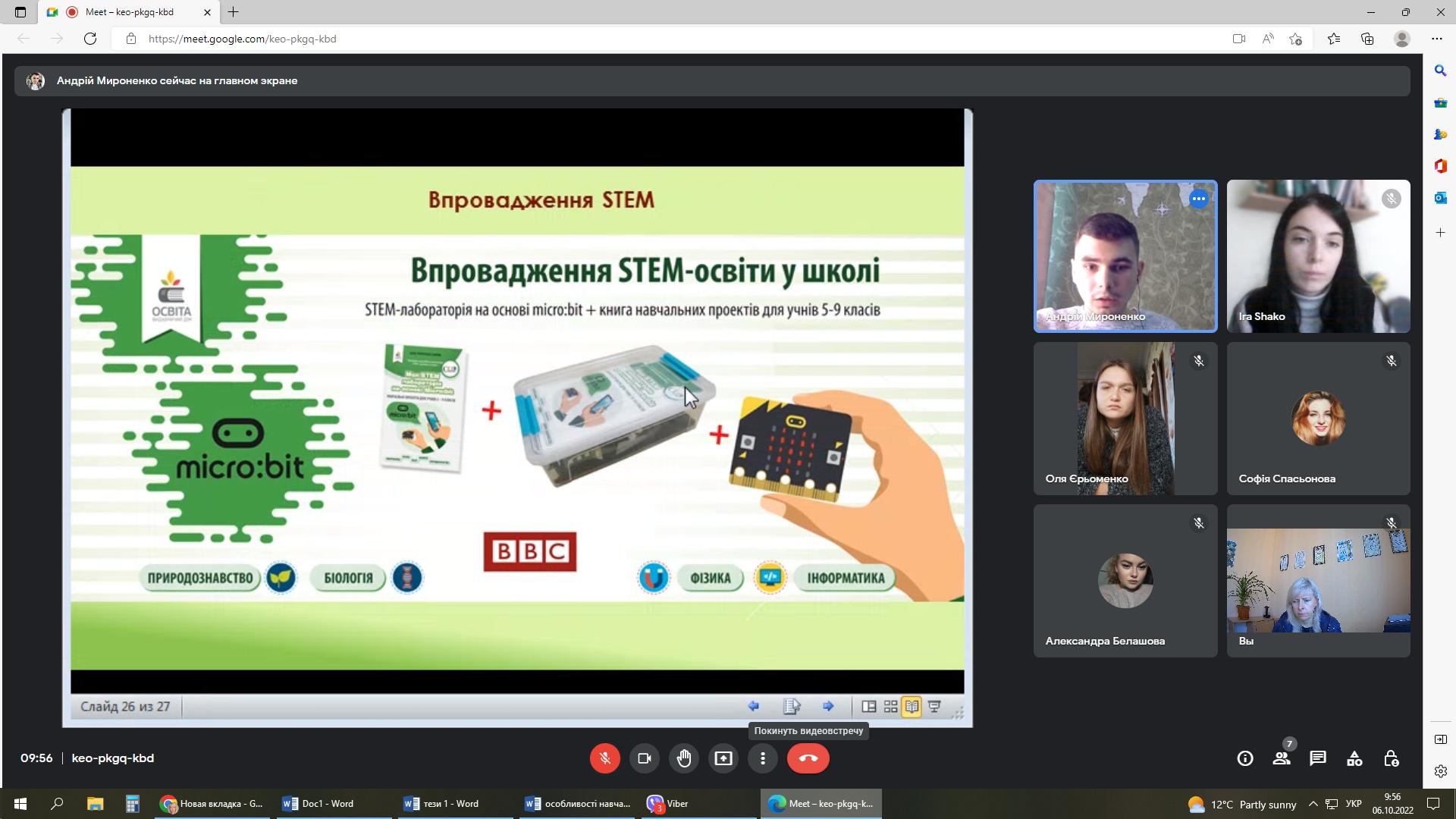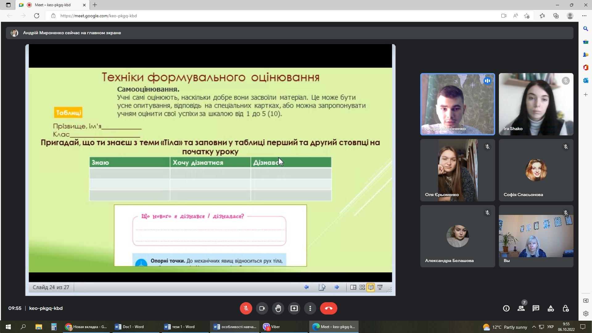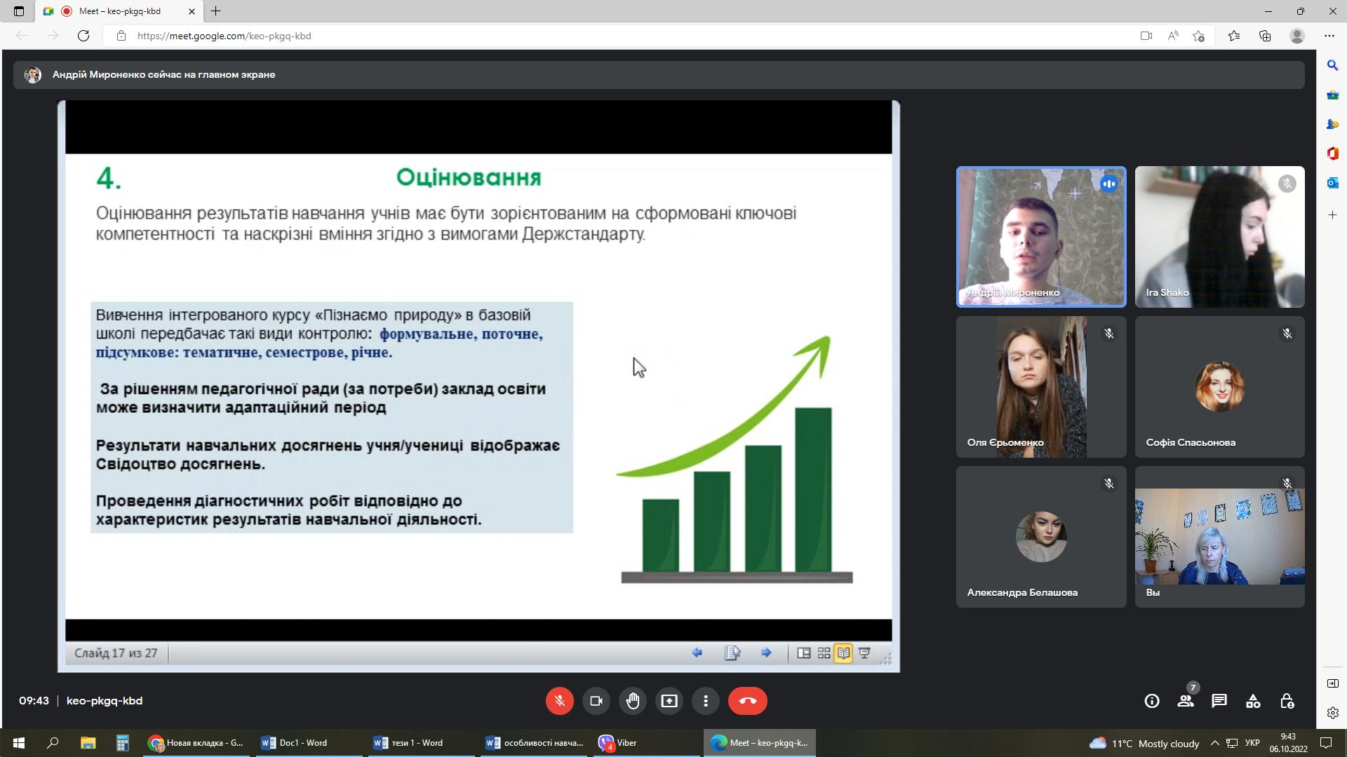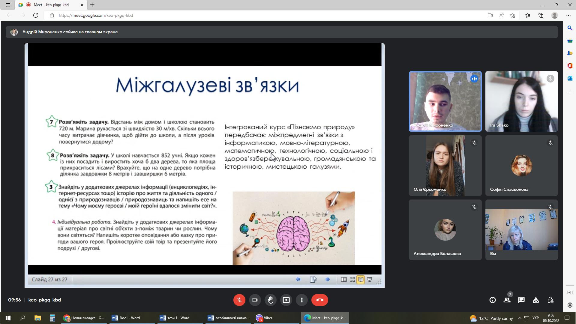 Темою онлайн заняття було обговорення особливостей навчання курсу «Пізнаємо природу» у 5 класі в рамках Нової української школи (НУШ). Участь у занятті взяли студенти 741 групи та магістранти 751 групи спеціальності 014 Середня освіта (Географія). У ході лекції було розглянуто структуру модельної програми курсу, проаналізовано очікувані результати, зміст інтегрованого курсу, види навчальної діяльності. Окремим питанням було обговорення матеріалу шкільного підручника, сучасних методів навчання в НУШ, проведенню експериментів в курсі «Пізнаємо природу», особливостям створення проєктів з учнями 5 класу. Значна увага була приділена питанням оцінювання знань та вмінь учнів в НУШ, принципам та критеріям оцінювання, особливостям організації самооцінювання учнів, технікам формувального оцінювання, впровадження STEM-освіти та міжгалузевим зв’язкам курсу. Також здобувачів освіти цікавили умови праці молодого вчителя географії, особливості роботи класного керівника та оплати праці в ЗЗСО. Лекція пройшла в форматі живого спілкування. Наприкінці лекції здобувачі освіти висловили щирі слова подяки Андрію Олександровичу за цікаву і змістовну розповідь та запланували й надалі зустрічатися для обговорення особливостей організації освітнього процесу в закладах загальної середньої освіти.